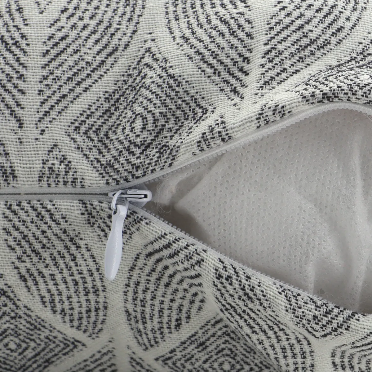 Housse de coussin de la collection NOUMEA qui met en scène un all-over de forme géométrique forme paon, pour habiller votre intérieur avec style.