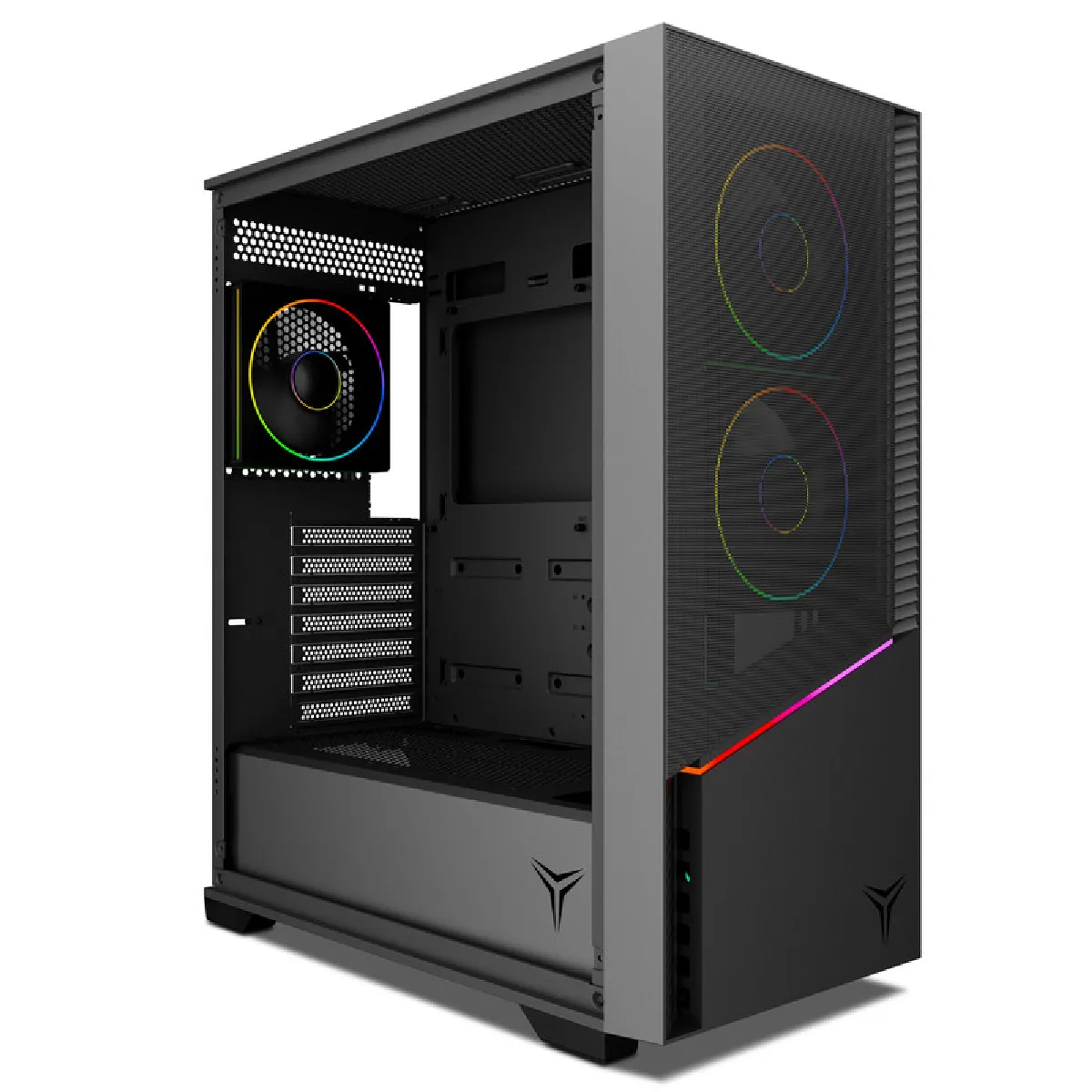 Le châssis en acier noir offre une base solide et un panneau latéral en verre trempé pour une vue claire sur l'éclairage ARGB. Le format tour prend en charge les cartes mères ATX et propose 7 emplacements PCI pour l'extension, pratique pour les cartes graphiques, cartes de capture ou contrôleurs additionnels. Les dimensions de 485 mm de hauteur, 210 mm de largeur et 485 mm de profondeur facilitent l'intégration sur ou sous un bureau, avec suffisamment d'espace interne pour organiser le câblage et optimiser la ventilation.