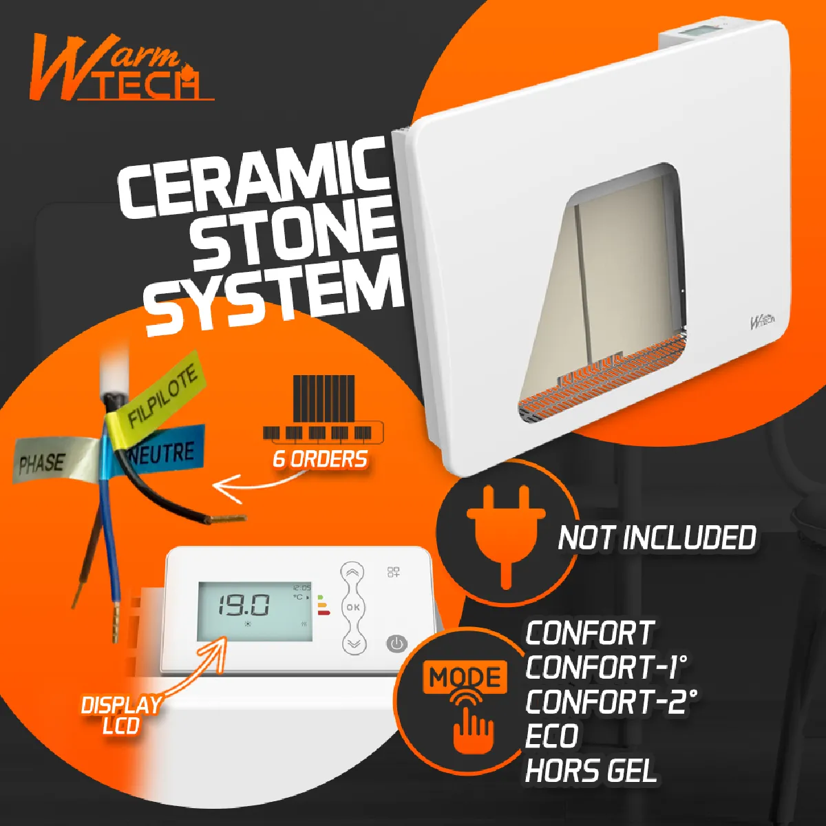 Warm Tech Radiateur inertie céramique 1000 W - IP24 - Fil pilote 6 ordres |