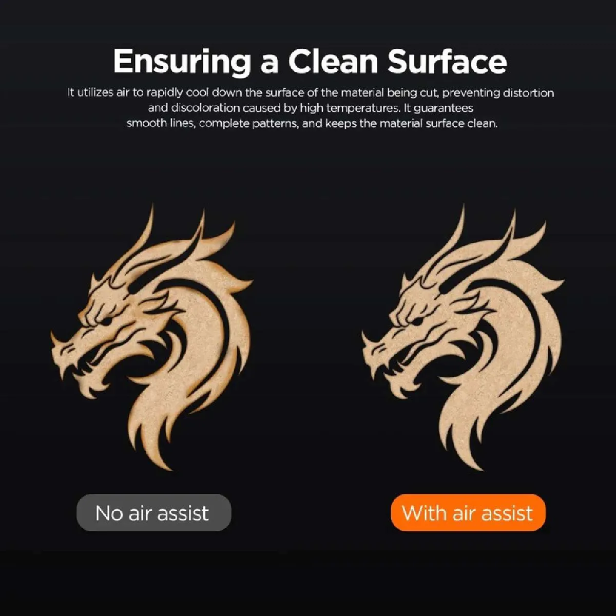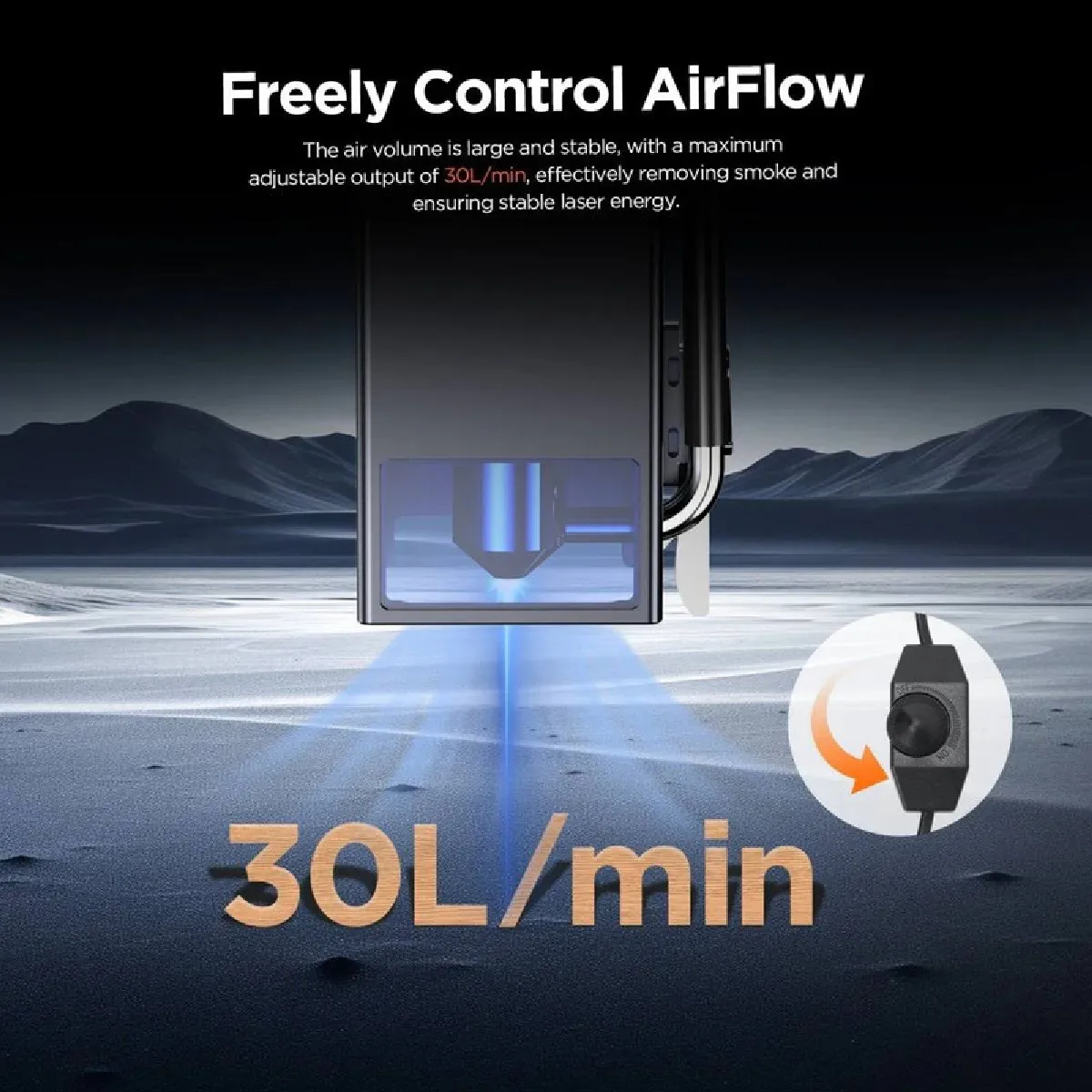 Le système d'assistance à l'air ACMER C4 est un dispositif d'assistance haute performance, offrant un débit d'air stable de 30 litres par minute, ajustable via un bouton rotatif (0-30 litres/min), pour éliminer efficacement la fumée et maintenir une énergie laser constante. Cela améliore la précision de la gravure et la propreté de la surface des matériaux, en réduisant les colorations dues à la chaleur. Le système est équipé d'une technologie de réduction du bruit et fonctionne à moins de 40 décibels, garantissant un environnement de travail silencieux tout en refroidissant efficacement les matériaux et en minimisant les résidus de fumée. Compatible avec la plupart des graveurs laser, le système ACMER C4 s'intègre sans problème à votre installation existante sans nécessiter de modifications supplémentaires. Le flux d'air focalisé et dirigé vers le bas de l'ACMER C4 augmente la pénétration laser, optimise les effets de combustion et refroidit rapidement les matériaux lors de processus de gravure ou de découpe à haute température, offrant des résultats plus propres, plus nets et plus précis. Le système ACMER C4 est conçu pour une installation et une utilisation faciles, avec des composants tels qu'un adaptateur secteur, un tuyau et une buse fournis, ainsi qu'un manuel d'utilisation détaillé pour vous permettre de commencer vos projets de découpe et de gravure laser en quelques minutes.