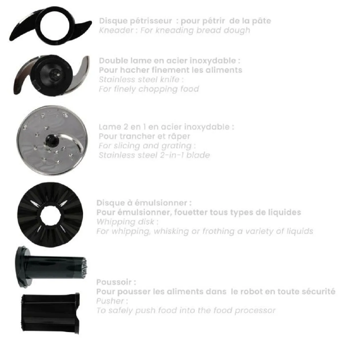 - Nombre de fonctions : 6 (pétrir, hacher, râper, émulsionner, trancher, mixer)