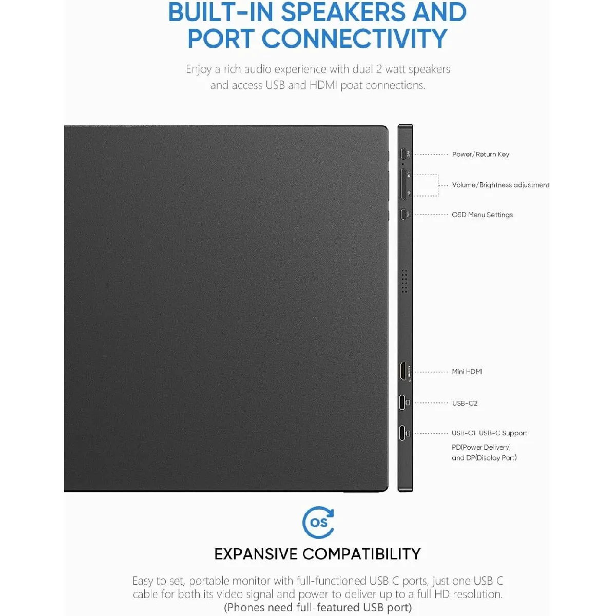 Large compatibilité pour le travail et les jeux : Le moniteur portable se connecte facilement aux ordinateurs portables, PC, Mac, Xbox, PS3, PS4, PS5, Nintendo Switch, etc. via le port Type-C ou Mini HDMI, garantissant une connexion stable et une transmission de données constante. Convient pour les présentations, les jeux, les vidéos, les séries TV, les photos, etc.