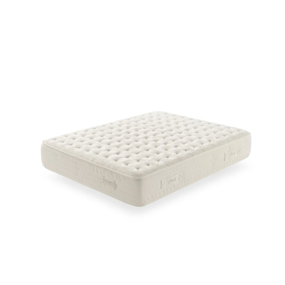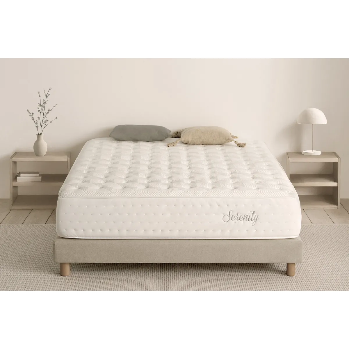 MATELAS SERENITY: repos ferme et adaptable. Le matelas Serenity a été conçu pour ceux qui recherchent un sommeil réparateur et de haute qualité. Il associe la technologie avancée des ressorts ensachés à des couches de mousse de haute densité, de mousse à mémoire de forme et de mousse Hypersoft. Avec une hauteur de 30 cm, il offre un équilibre parfait entre fermeté, adaptabilité et respirabilité, épousant précisément les formes du corps et soutenant lalignement naturel de la colonne tout au long de la nuit.