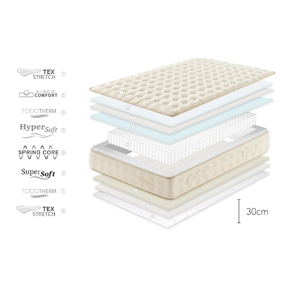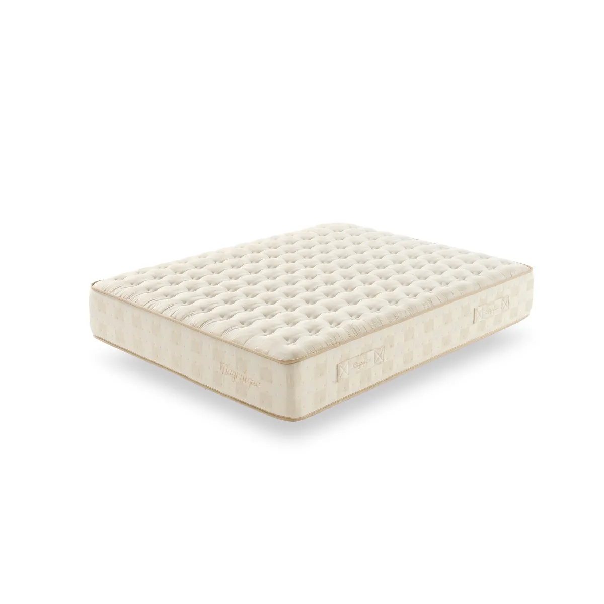 Le matelas Magnifique a été pensé pour ceux qui recherchent une expérience de sommeil incomparable. Il associe le meilleur de la technologie à ressorts ensachés à des couches de mousse à mémoire de forme et de mousse Hypersoft. Dune hauteur totale de 30 cm, il offre un soutien optimal pour toutes les morphologies et sadapte avec précision à chaque mouvement au cours de la nuit.