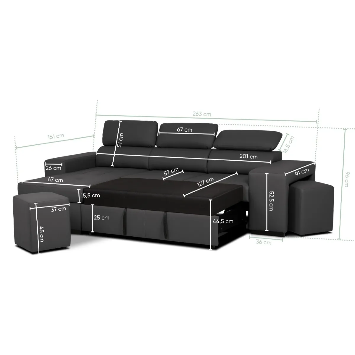 - Dimensions : 96 cm (H) x 263 cm (L) x 127 cm (P)
