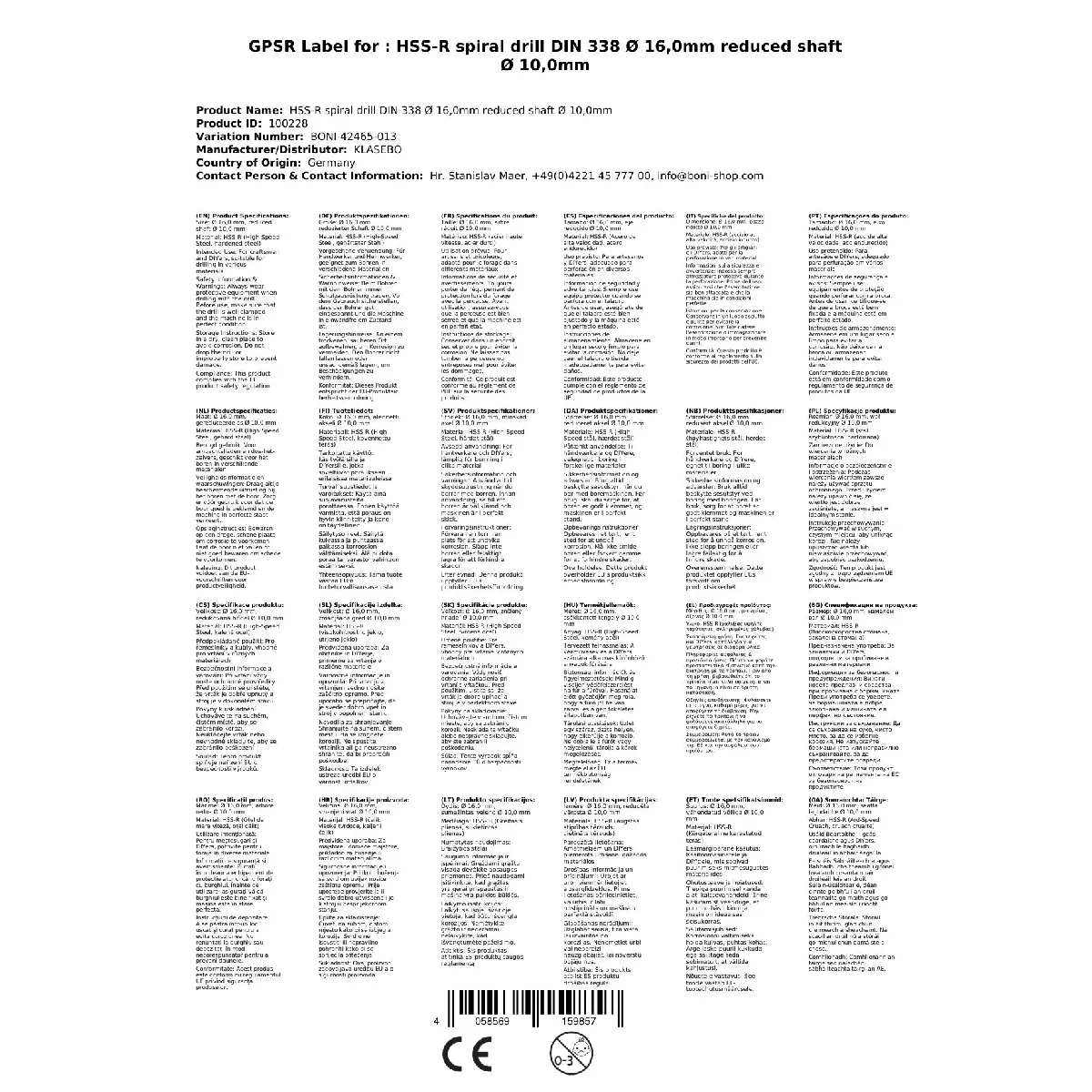 Klasebo Foret métal HSS spiralé - 16 mm |