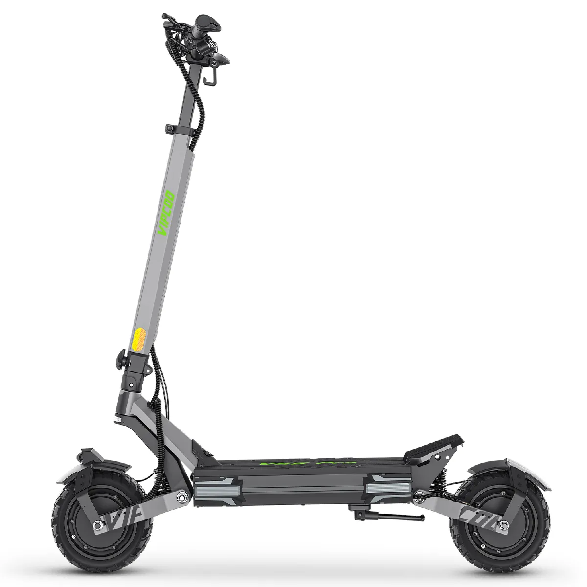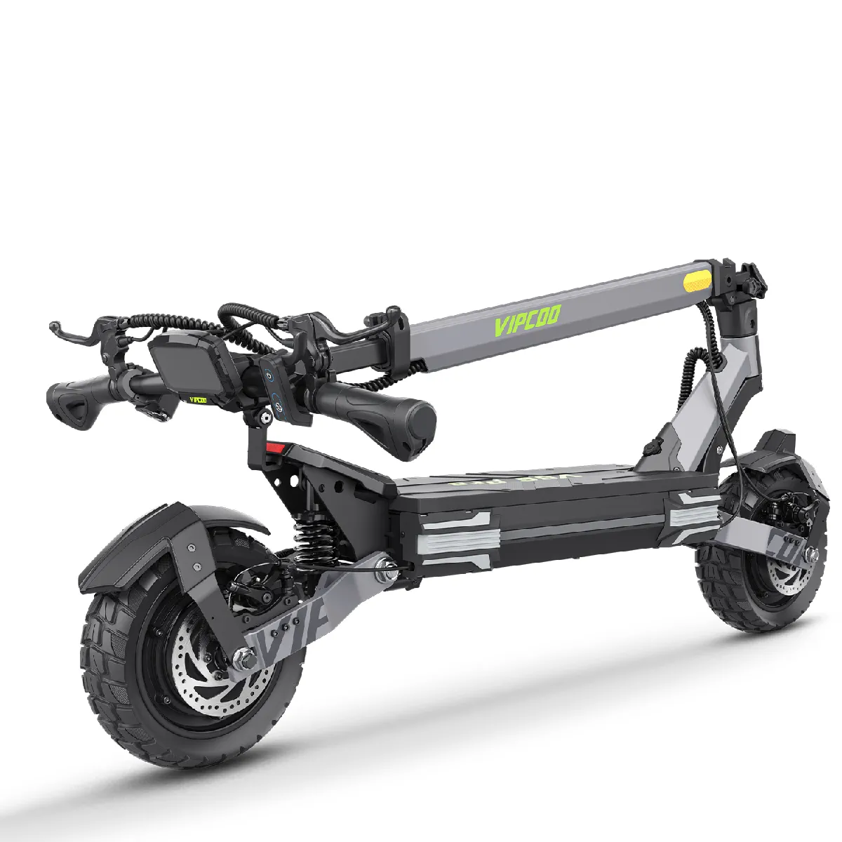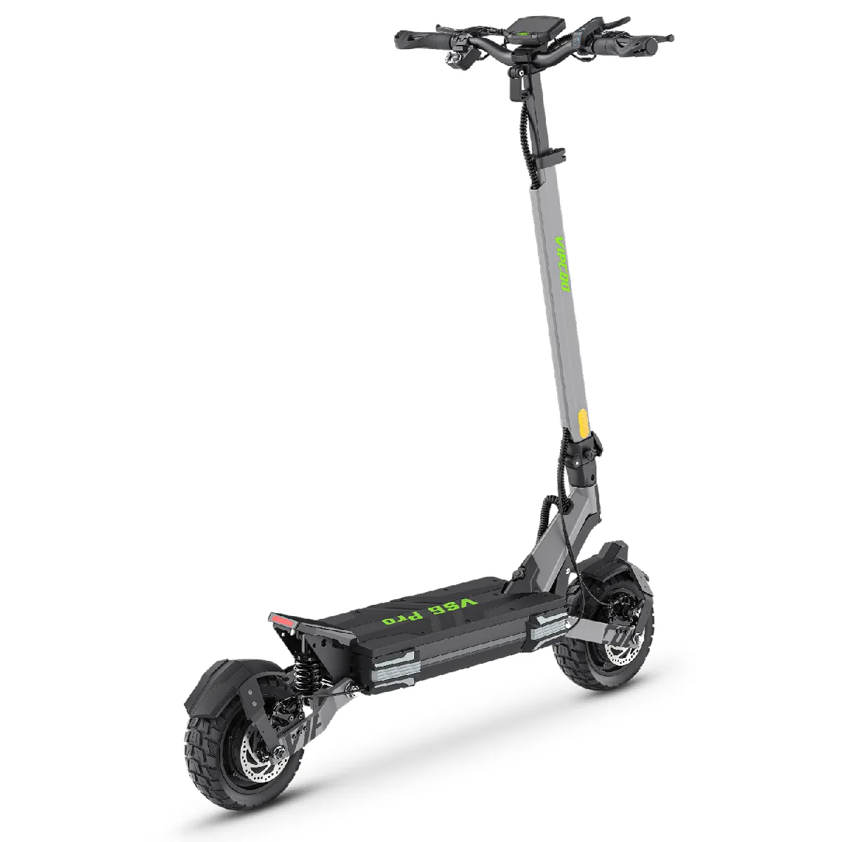 Conçu pour les terrains accidentés, il est équipé de pneus tout-terrain de 10 pouces à sculptures autonettoyantes et d'une suspension à 4 bras en alliage de magnésium qui absorbe les chutes jusqu'à 15 cm à 40 km/h. Le cadre renforcé en alliage fer-aluminium supporte jusqu'à 120 kg.
