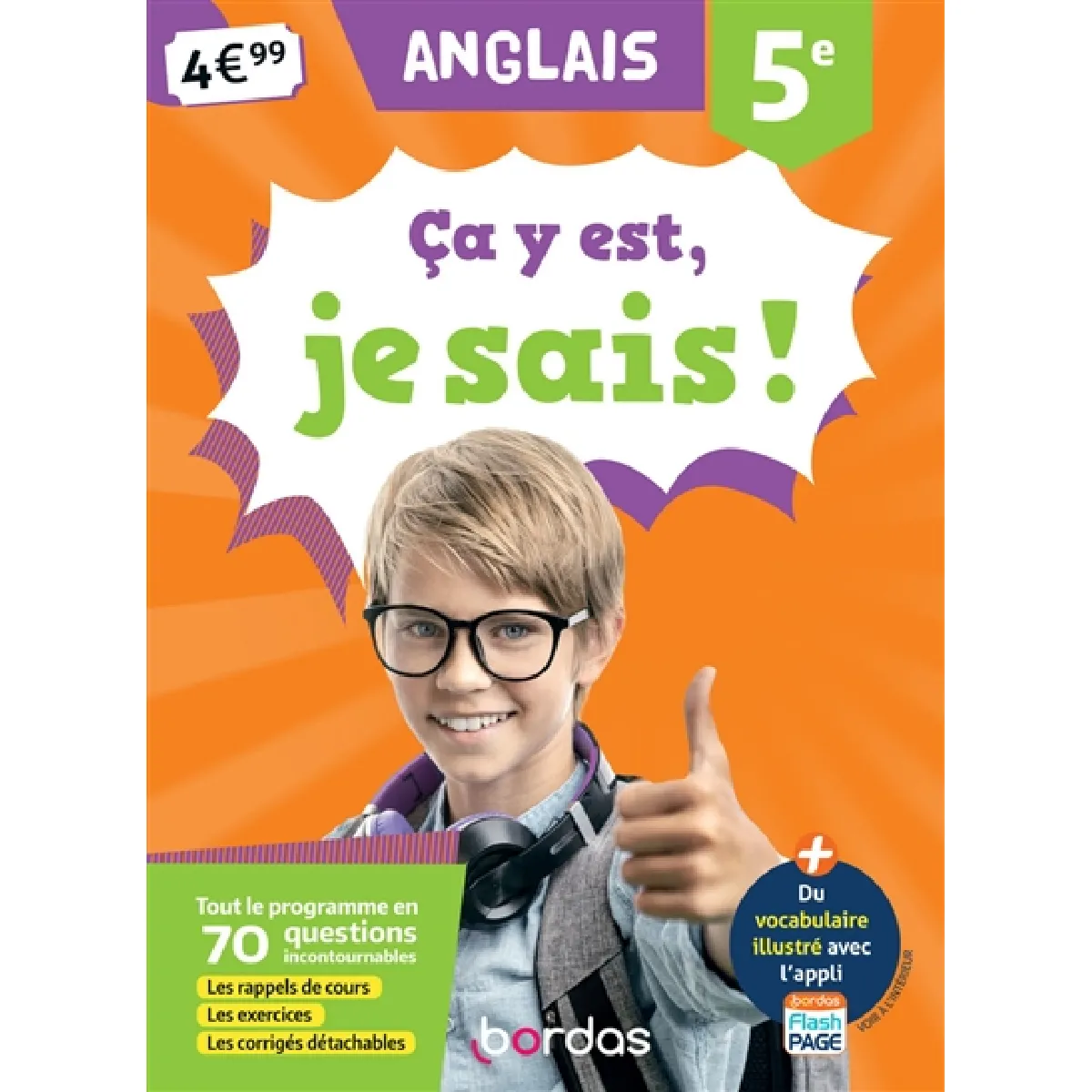 Quatrième de couverture : Anglais 5e Du CP à la 3e, la collection qui provoque le déclic chez votre enfant ! Ça y est, je sais ! répond aux 70 questions que votre enfant se pose en anglais avec : Une explication courte et claire de la règle Une astuce pour la retenir ou l'appliquer facilement Des exercices de difficulté progressive pour s'entraîner Vous trouverez aussi dans ce cahier : Des conseils pour accompagner votre enfant Les corrigés de tous les exercices à détacher + Du vocabulaire illustré à télécharger avec l'appli Bordas Flash Page