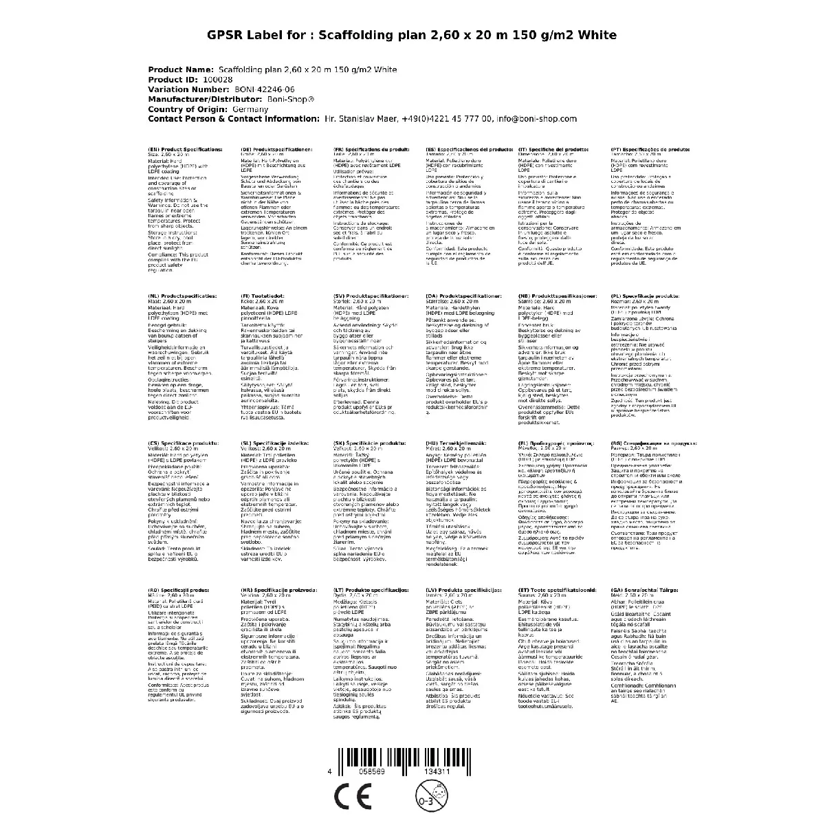 boni-shop Bâche d'échafaudage 2,60x20m, 150 g/m², Bâche de chantier Blanche |