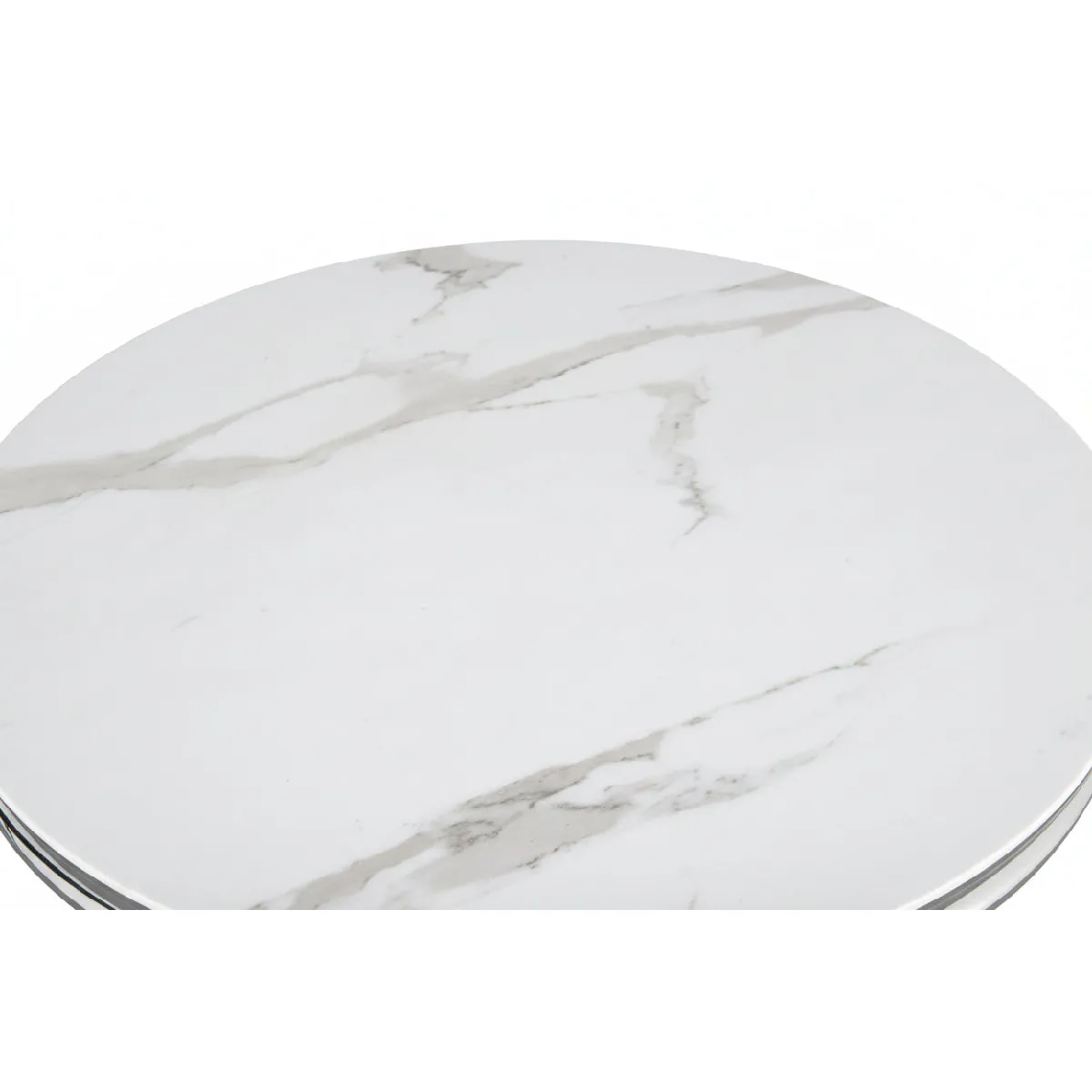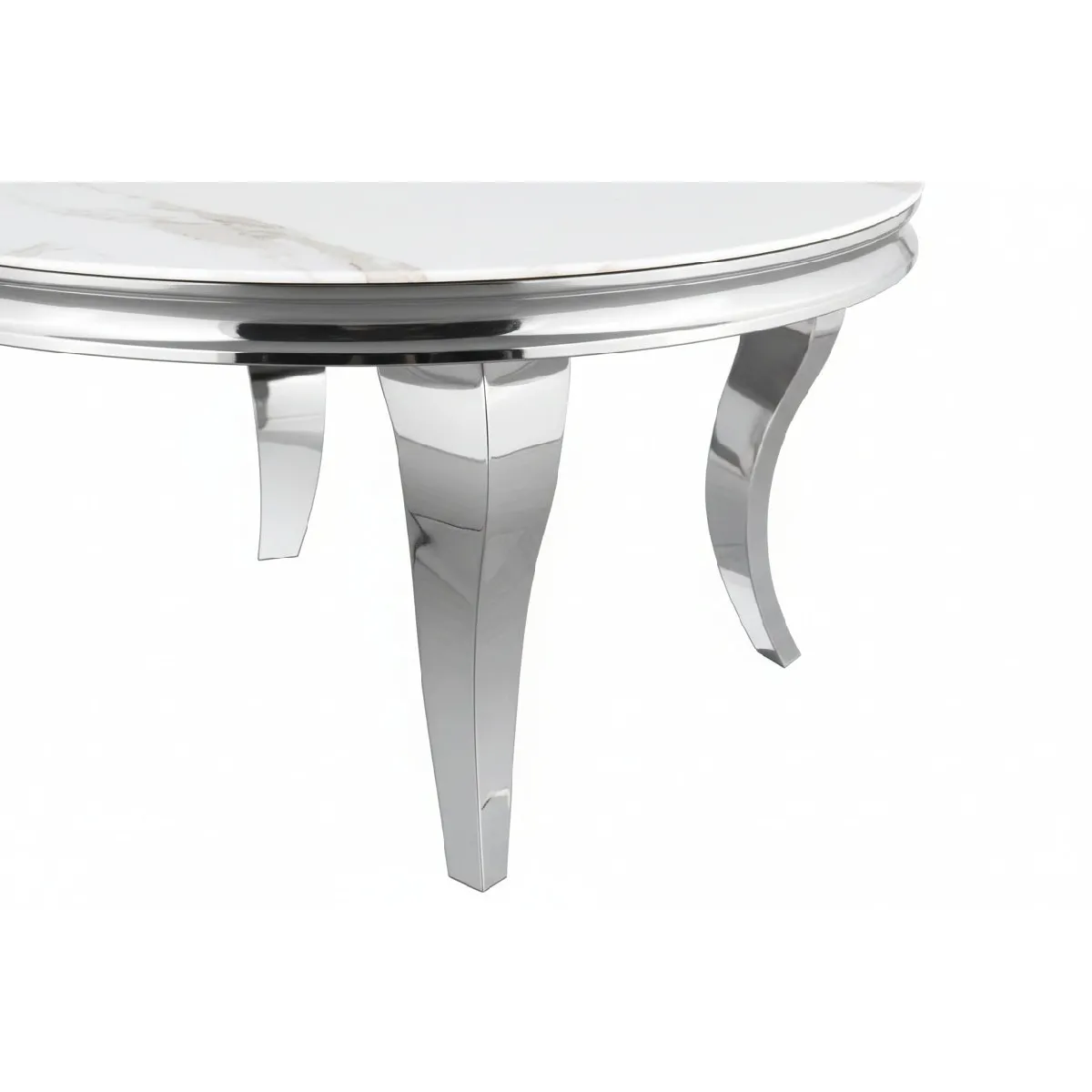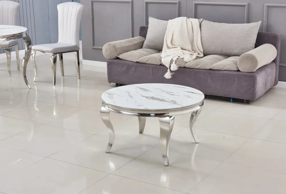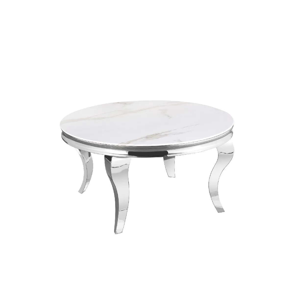 Table basse ronde baroque marbré blanc, structure métal finition chrome