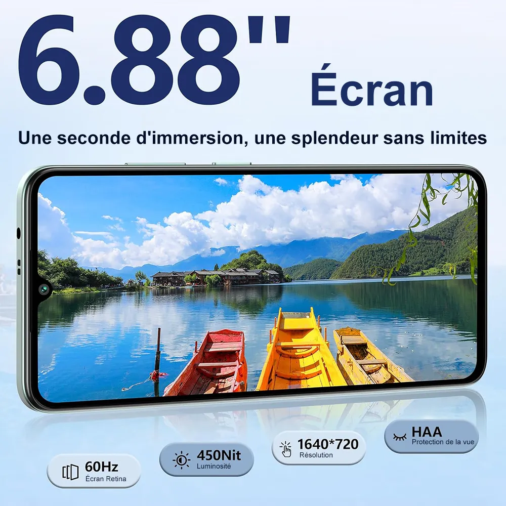 - Écran 6.88" HD+ 720 x 1640, format 20.5:9, 60 Hz
