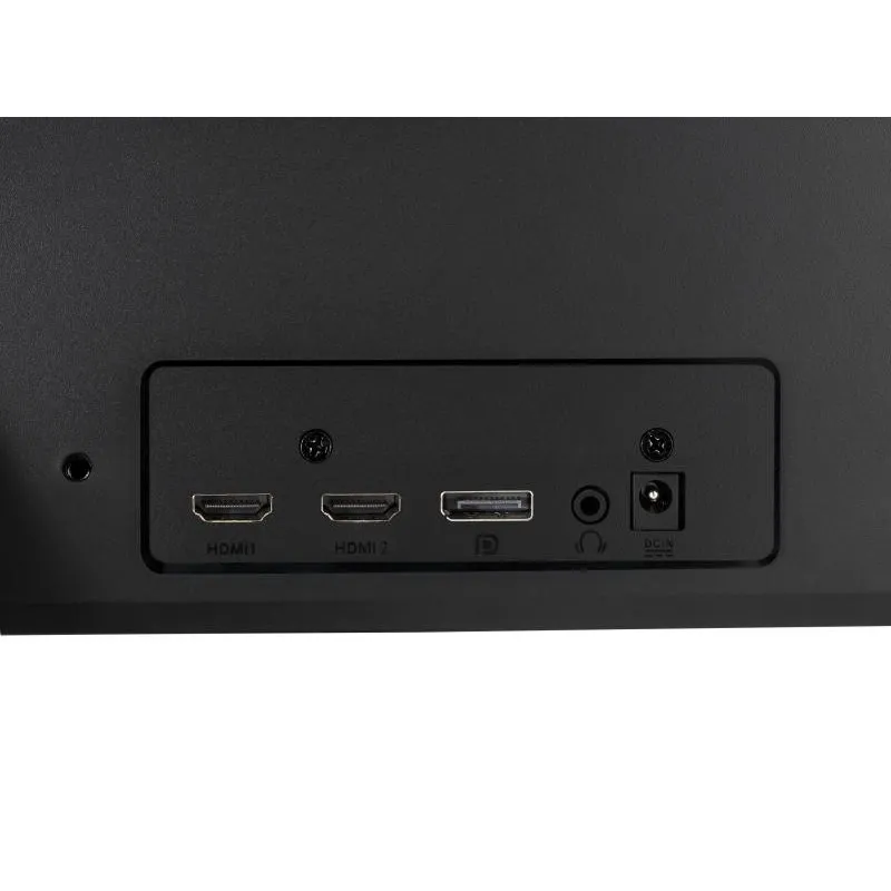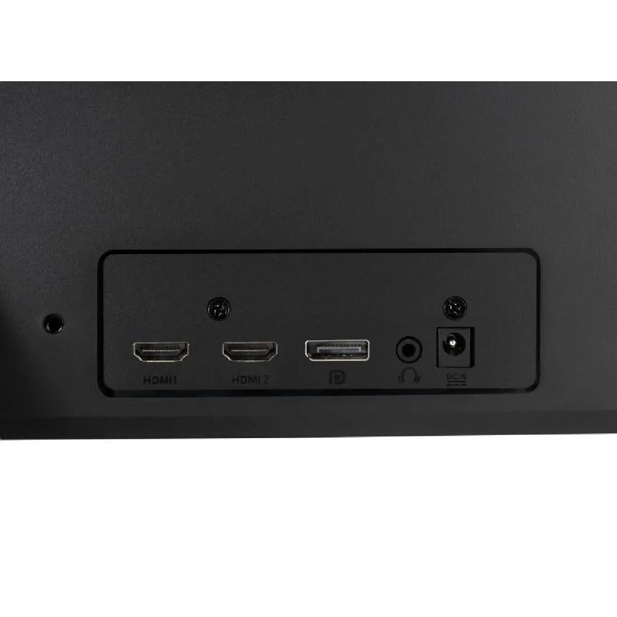 La connectique comprend deux entrées HDMI, un DisplayPort, une prise casque et l'alimentation via DC-in.