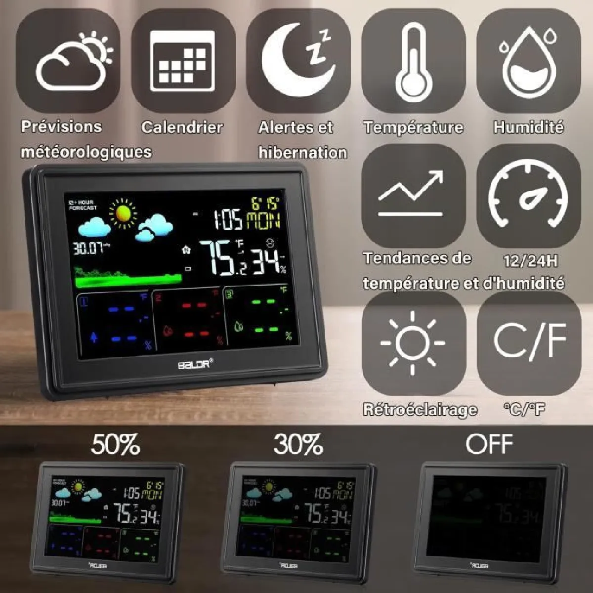 Cette station météo multifonctionnelle avec 3 émetteurs extérieurs peut surveiller la température et l'humidité de 4 endroits différents en même temps. Les données sont mises à jour toutes les 30 secondes. La distance de transmission entre l'émetteur et la station météo est de 100 m. Notre station météo sans fil dispose d’un grand écran couleur.