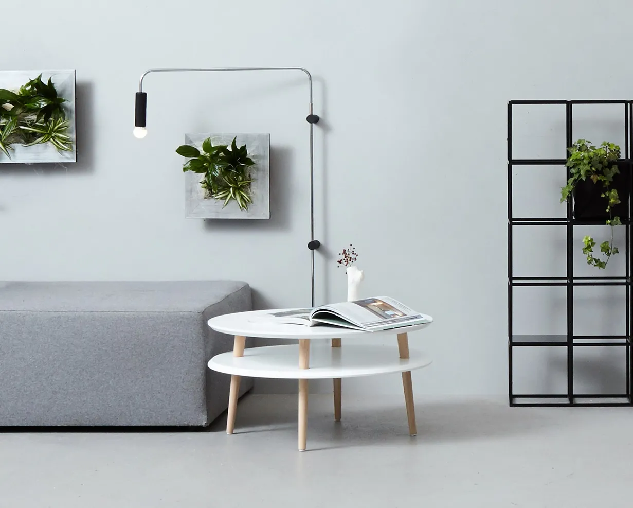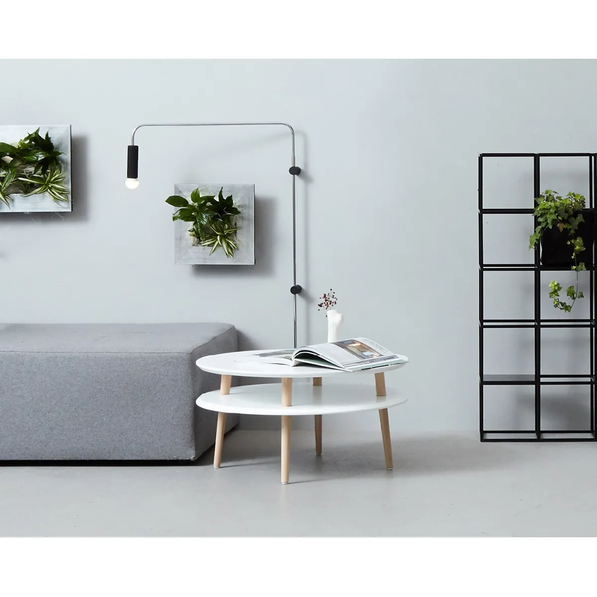Le double plateau procure deux surfaces complémentaires pour poser et ranger, limitant l'encombrement visuel autour du canapé. La table accueille aisément une lampe, un vase ou des tasses sur le niveau supérieur, tandis que l'étagère inférieure conserve magazines, accessoires multimédias et petits indispensables à portée immédiate. La géométrie ronde favorise la circulation, particulièrement utile dans les espaces compacts, tout en restant stable grâce aux pieds en hêtre.