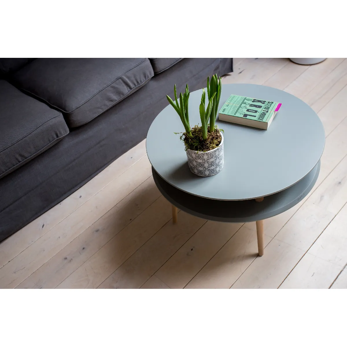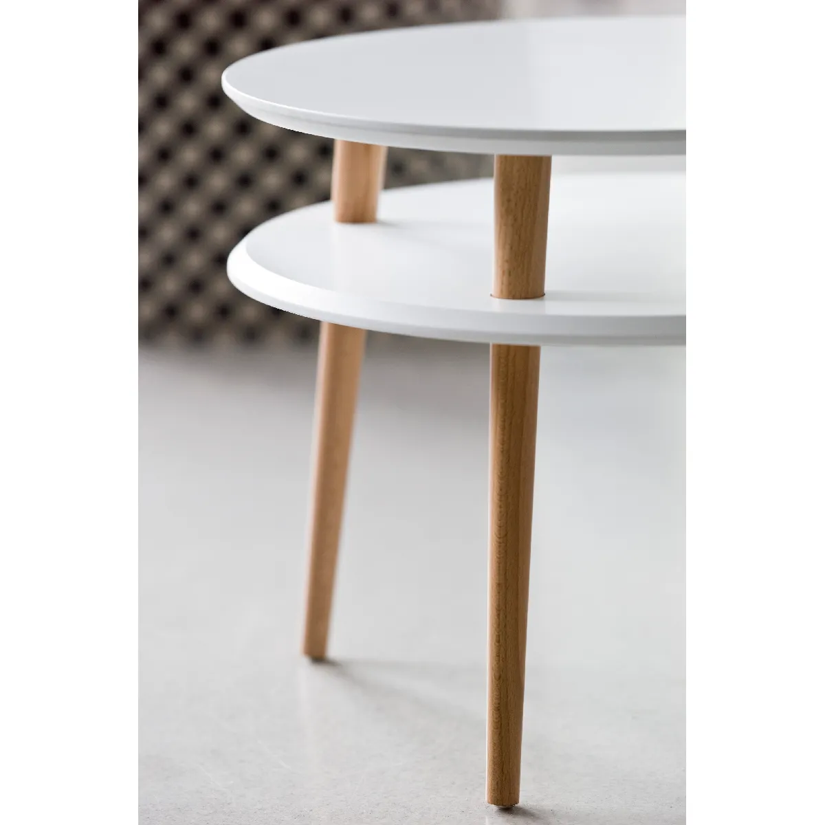La surface à deux niveaux optimise l'espace du salon en séparant clairement les objets du quotidien des éléments décoratifs. La structure associe pieds en hêtre robuste et plateaux en MDF laminé et laqué pour une présence discrète et fonctionnelle. Le format 70 cm de diamètre et 45 cm de hauteur s'intègre aisément près d'un canapé, tout en offrant une zone d'appui confortable pour boissons et accessoires. Le design minimaliste et les lignes épurées facilitent l'harmonisation avec une décoration existante, en particulier dans un intérieur contemporain. L'ensemble propose une organisation simple afin de garder télécommandes, magazines et petits objets à portée de main sans encombrer la pièce.