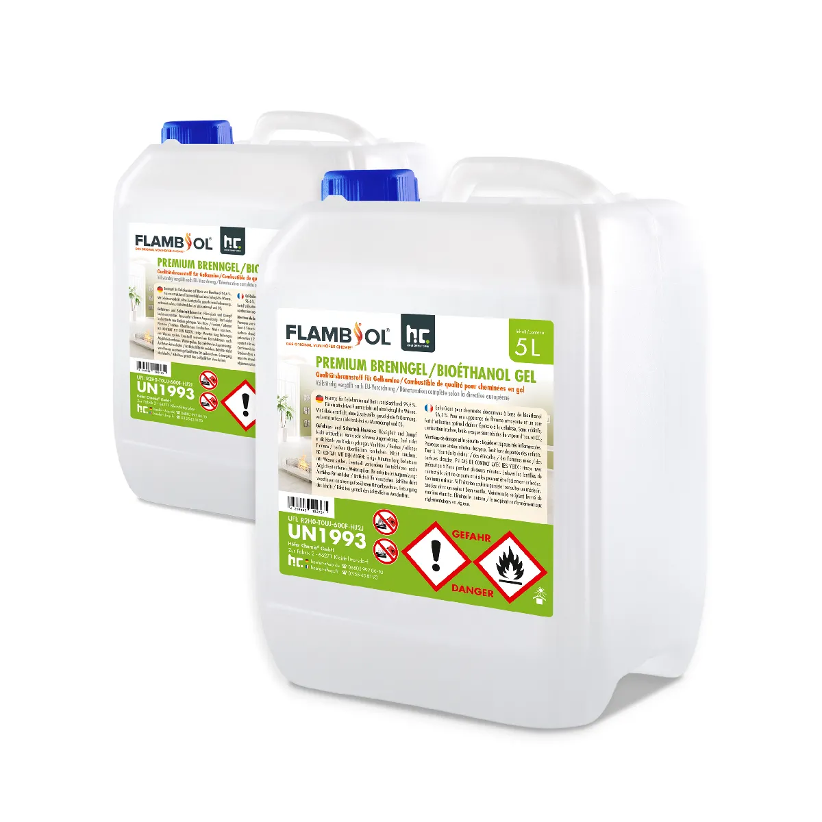 Découvrez le gel combustible bioéthanol FLAMBIOL® Premium en bidon de 5 litres, idéal pour vos cheminées d'intérieur et d'extérieur. Ce produit de Höfer Chemie se distingue par sa formule améliorée, offrant une combustion prolongée grâce à des ingrédients écologiques.
