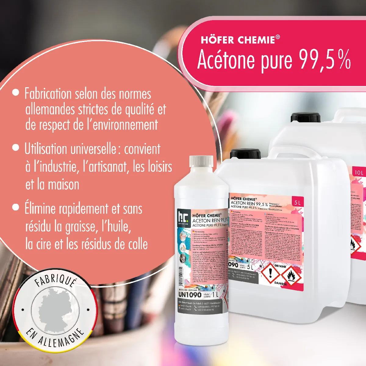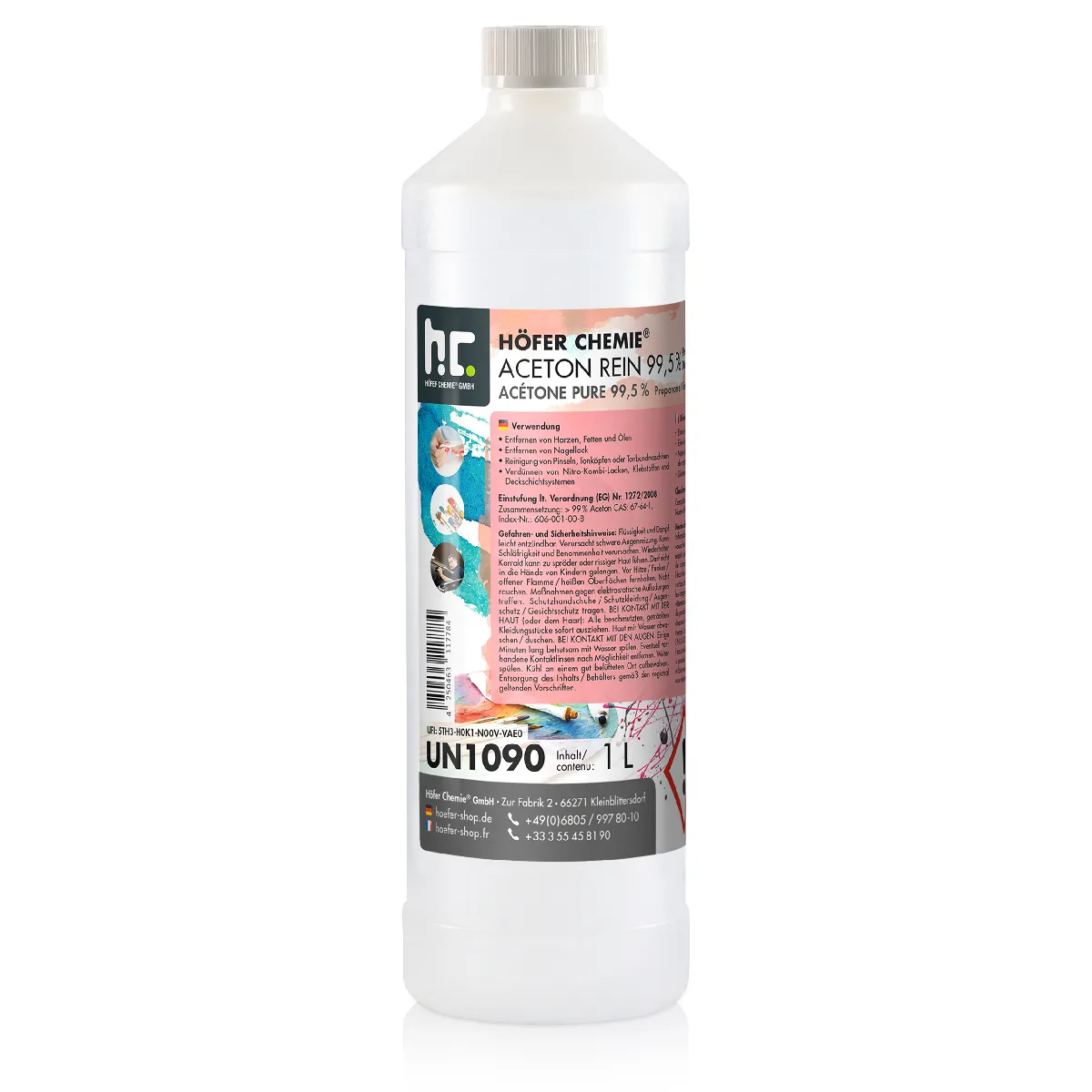 NE CONVIENT PAS POUR LA FABRICATION DE DÉSINFECTANTS !!! Découvrez notre acétone pure de 1 litre, avec une pureté exceptionnelle de 99,5 %, proposée par Höfer Chemie. Grâce à sa qualité technique élevée, notre acétone est idéale pour une multitude d'applications, tant dans les ménages que dans les laboratoires. Économique et polyvalente, elle peut être diluée selon vos besoins, ce qui la rend parfaite pour les travaux de nettoyage à domicile.