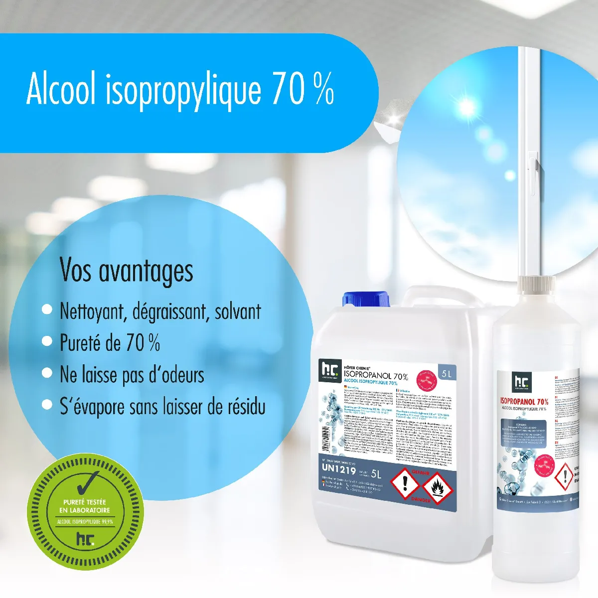 Attention : L'isopropanol que nous proposons est un produit technique et ne doit pas être utilisé pour des applications médicales ni comme désinfectant. Veuillez le garder hors de portée des enfants et éviter tout contact direct avec des flammes nues ou les yeux. Optez pour la qualité avec l'alcool isopropylique 70% de Höfer Chemie®.