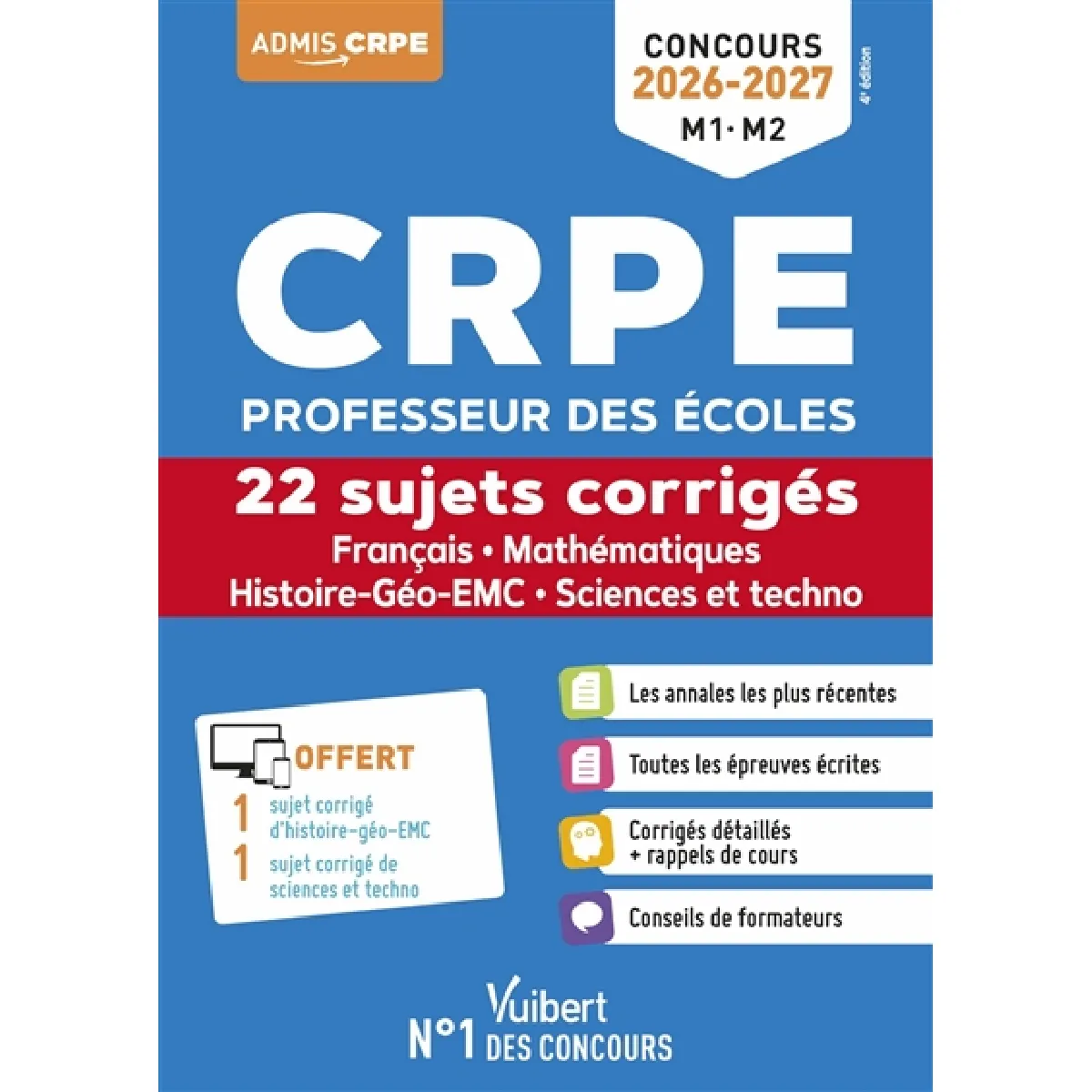 Quatrième de couverture : Concours 2026 - 2027 M1 M2 CRPE Professeur des écoles 22 sujets corrigés Français Mathématiques Histoire-Géo-EMC Sciences et techno L'ouvrage indispensable pour vous entraîner avant les écrits 22 sujets officiels, récents et complets 6 sujets de français ; 6 sujets de mathématiques ; 5 sujets d'histoire-géo-EMC ; 5 sujets de sciences et techno. Corrigés détaillés pour vous autoévaluer et réviser les notions incontournables Conseils du formateur pour répondre aux attentes du jury et déjouer les pièges des épreuves Tout le programme Français Cycle 4. Partie « L'étude de la langue » des programmes de seconde et première. Mathématiques Cycle 4 Partie « Nombres et calculs » du programme de seconde. Histoire, Géo et EMC Savoirs disciplinaires du cycle 1 au cycle 4. Savoirs enseignés des cycles 1, 2 et 3. Sciences et Techno Savoirs disciplinaires du cycle 1 au cycle 4.