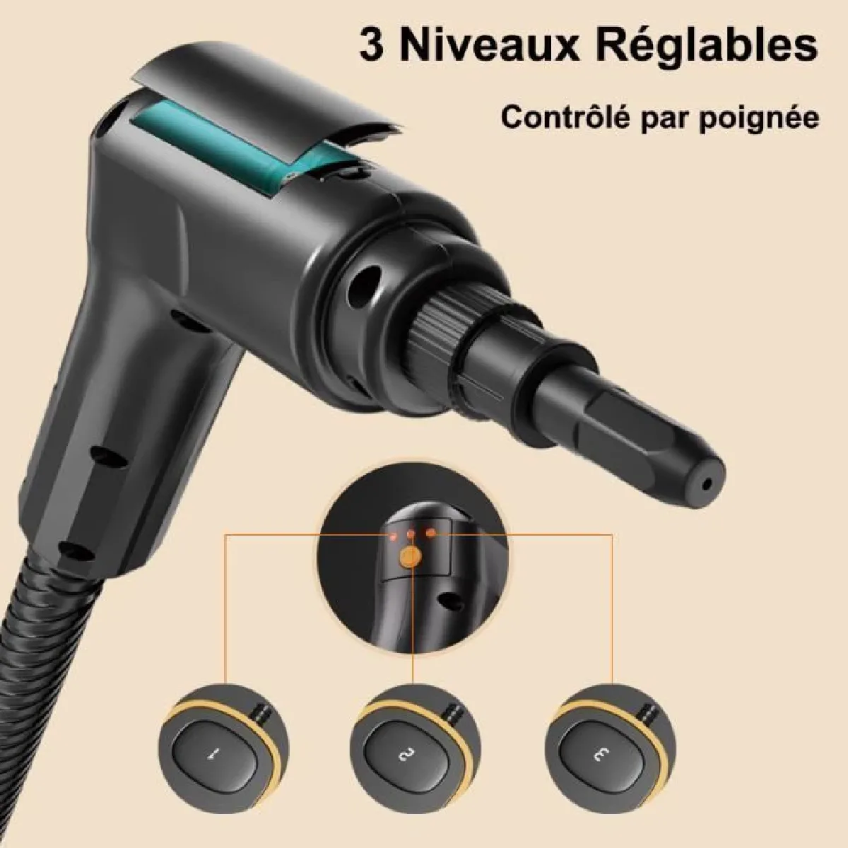 Avec une hauteur de 25 cm, une largeur de 20,3 cm et une profondeur de 17,5 cm, ce nettoyeur se manipule aisément et se range dans un placard. Le poids contenu de 1,76 kg réduit la fatigue lors des déplacements entre les pièces. La couleur noire s'intègre discrètement au matériel d'entretien domestique. Les dimensions compactes facilitent la prise en main lors des interventions ciblées sur plans de travail, encadrements de fenêtres, robinets ou surfaces de salle de bain.