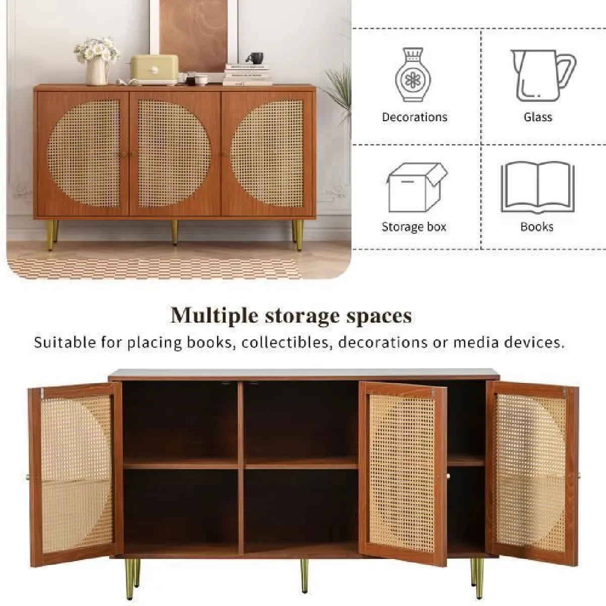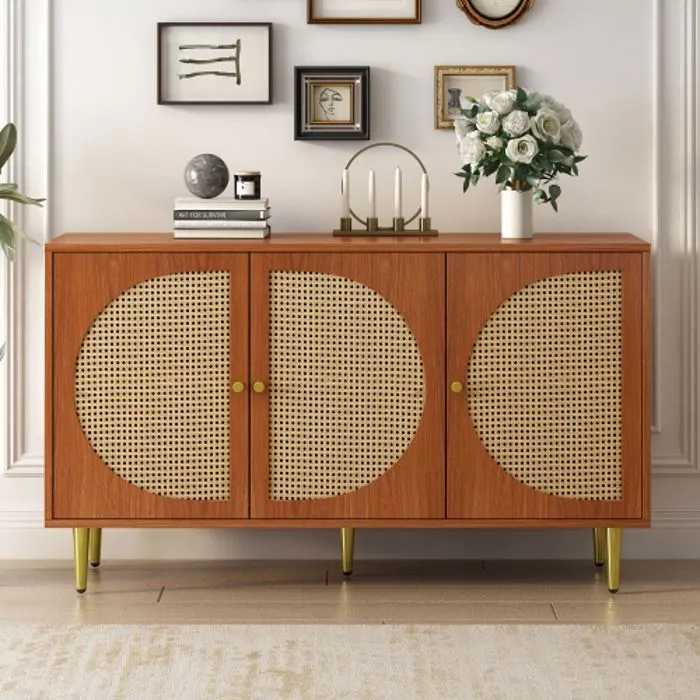 Un agencement clair facilite le quotidien grâce à 3 portes, 6 tiroirs et 2 étagères internes pour séparer vaisselle, linge de table et accessoires. Le format pratique de 129,8 x 40 x 76 cm s'intègre dans une salle à manger, un salon ou un bureau sans encombrer, tout en offrant une surface supérieure utile pour lampes et objets décoratifs. La teinte noyer et le style moderne s'accordent avec de nombreux intérieurs. Le montage est requis et le meuble est réalisé en panneau de particules avec poignées en métal pour une manipulation simple au quotidien.