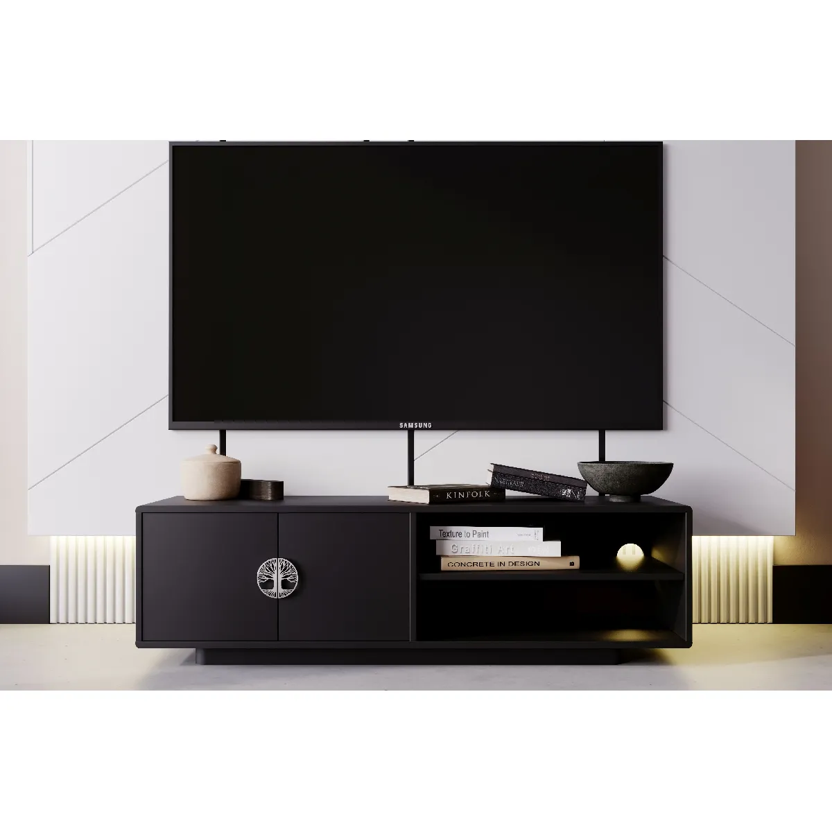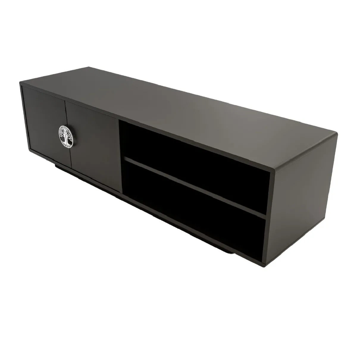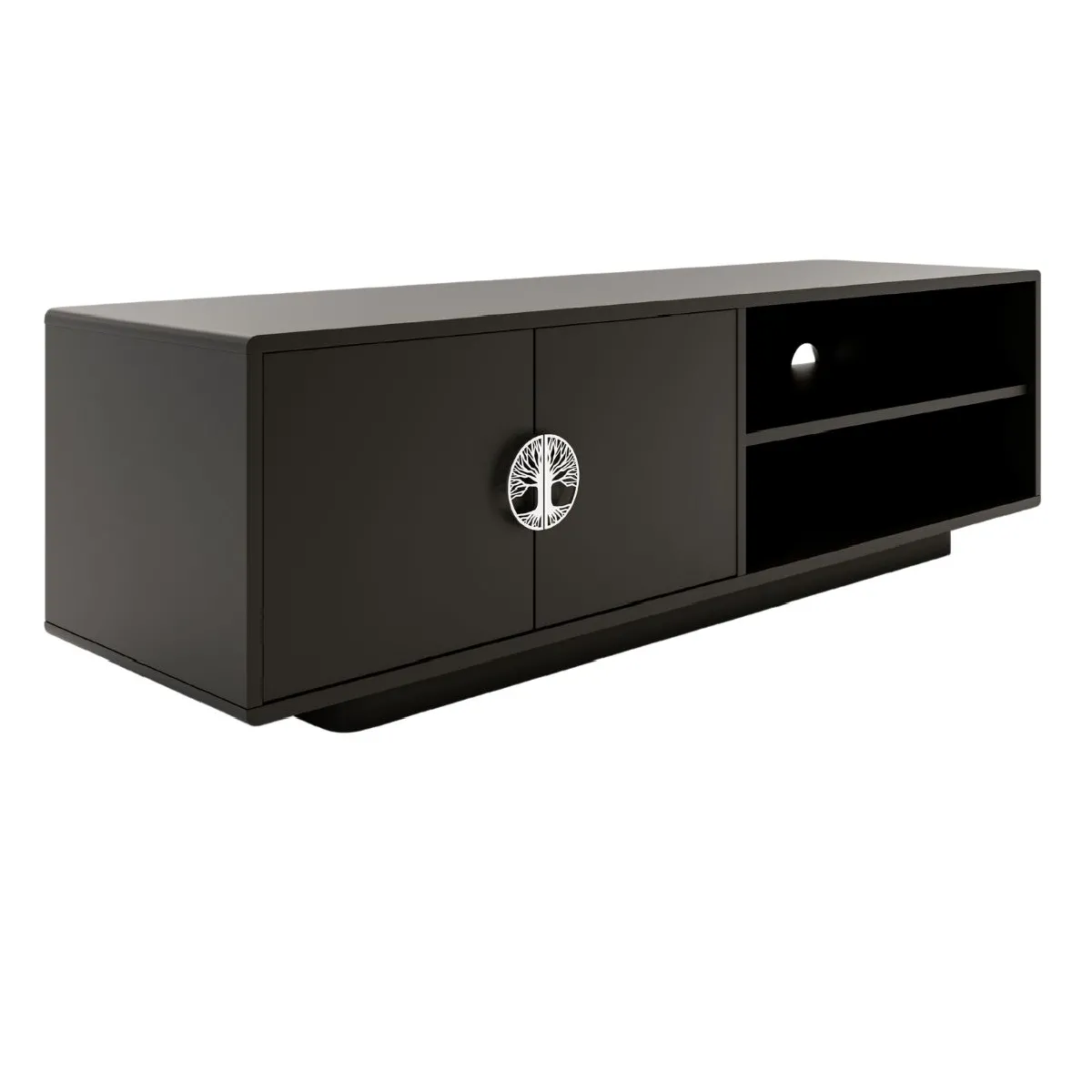 L'organisation du coin multimédia gagne en clarté grâce à un vaste espace fermé complété par une étagère ouverte avec passage de câbles. Le corps en MDF de 18 mm reçoit une finition noire semi-mate aux bords arrondis qui limite les arêtes vives et s'intègre aisément aux intérieurs contemporains. Les poignées métalliques dorées, disposées en cercle avec motif ajouré, apportent une touche décorative sans nuire à l'usage au quotidien. À 139 cm de longueur et 40,5 cm de hauteur, ce meuble trouve sa place sous la plupart des téléviseurs, tout en laissant de la place aux boîtiers et accessoires. La base basse crée un effet visuel léger, tout en assurant une pose stable.