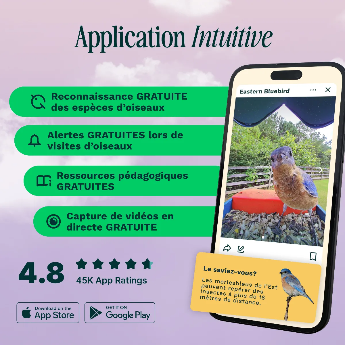 Le respect de la vie privée est au cœur de sa conception. La caméra capture uniquement ce qui se passe à l’intérieur de la mangeoire et toutes les images sont traitées directement sur l’appareil. Vous gardez un contrôle total de vos données via l’application.