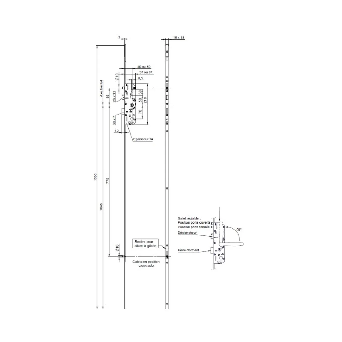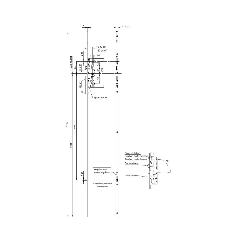 Serrure multipoints 4 points - 3 galets + 1 pêne dormant - Entraxe 70 mm - Axe cylindre 40 mm - Acier - Norme EN 12209 - Réglage des galets par vis 6 pans