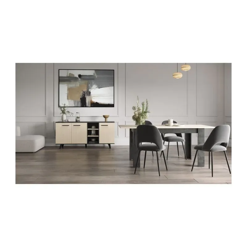L'agencement du séjour gagne en cohérence grâce à un ensemble complet associant enfilade, buffet haut et table avec allonge. La finition bicouleur Chêne de fil / Sidewalk crée une ambiance contemporaine tout en restant sobre. Pensé pour un usage quotidien, cet ensemble offre volumes optimisés et surfaces faciles à organiser, tout en conservant une ligne graphique. La structure en panneaux de particules peints assure un rendu homogène, et les pieds noirs obliques confèrent une stabilité appréciable avec une touche industrielle. L'harmonie des éléments permet d'équiper la salle à manger avec des solutions coordonnées.