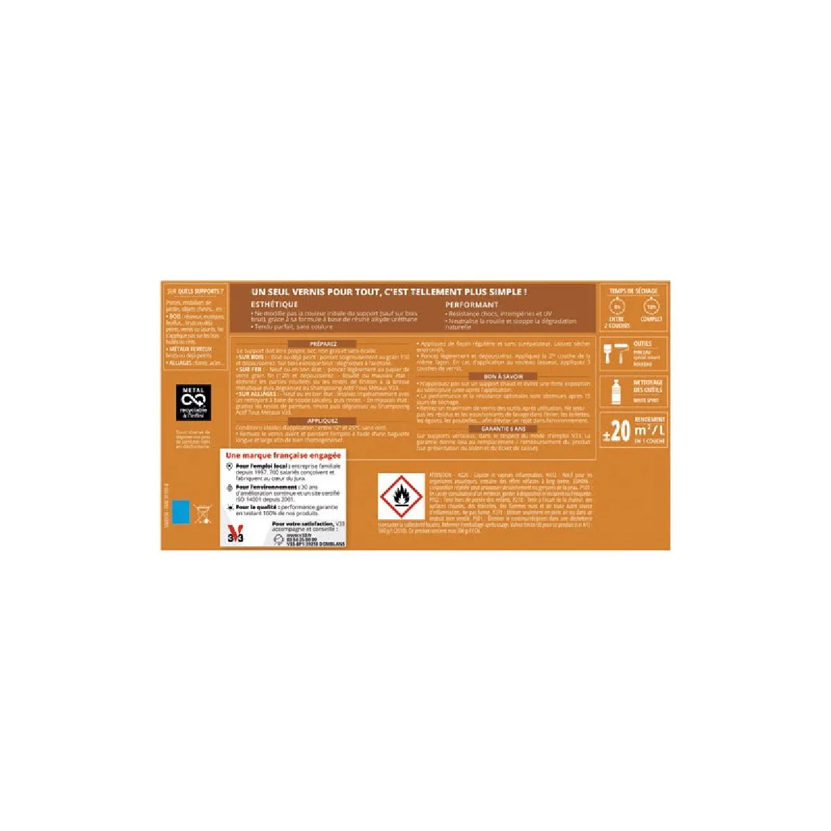 - Vernis multi-matériaux adapté pour bois résineux, exotiques et métaux ferreux