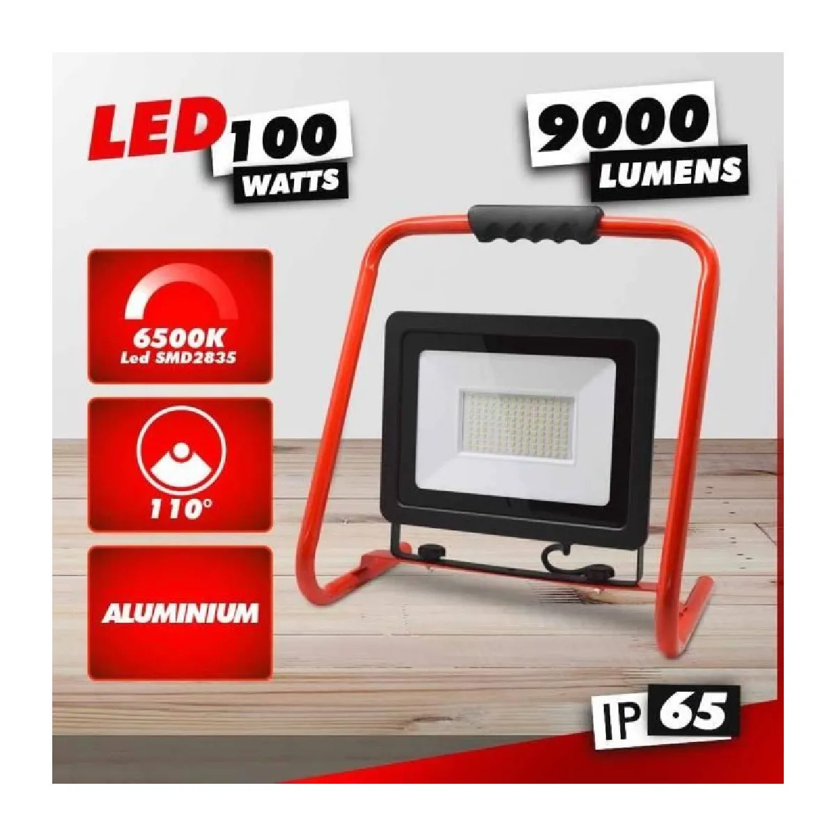 Le projecteur intègre des LEDs SMD2835 offrant un rendement élevé de 9000 lumens à seulement 100 W, permettant un éclairage puissant et uniforme des zones de travail.