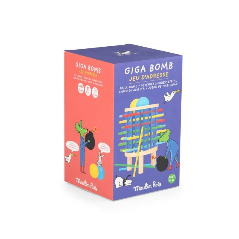 Idéal pour animer de courtes sessions, ce jeu d'adresse propose des parties rapides d'environ dix minutes et une prise en main accessible dès 4 ans. Les joueurs placent leur boule dans la tour et tentent de la conserver sans faire chuter la Giga Bombe en bois. La mécanique se prête à des moments partagés en famille grâce à des règles simples et un format compact qui se range facilement. La structure en bois et contreplaqué offre une manipulation agréable tout en restant légère, adaptée aux petites mains et à des défis d'adresse qui stimulent la concentration.