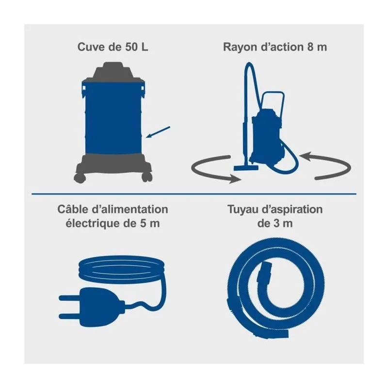 Le moteur électrique de 1400 W fournit jusqu'à 20 kPa d'aspiration pour capter poussières, gravats légers et liquides. La fonction soufflage aide à regrouper les déchets ou à dégager des surfaces difficiles d'accès. Avec sa cuve en acier inoxydable de 50 litres résistante à l'usure, l'appareil accepte des volumes importants, limitant les interruptions pour vidange. Le verrouillage rapide permet un accès direct au sac et au filtre pour maintenir des performances constantes lors d'interventions répétées sur chantier comme en atelier.