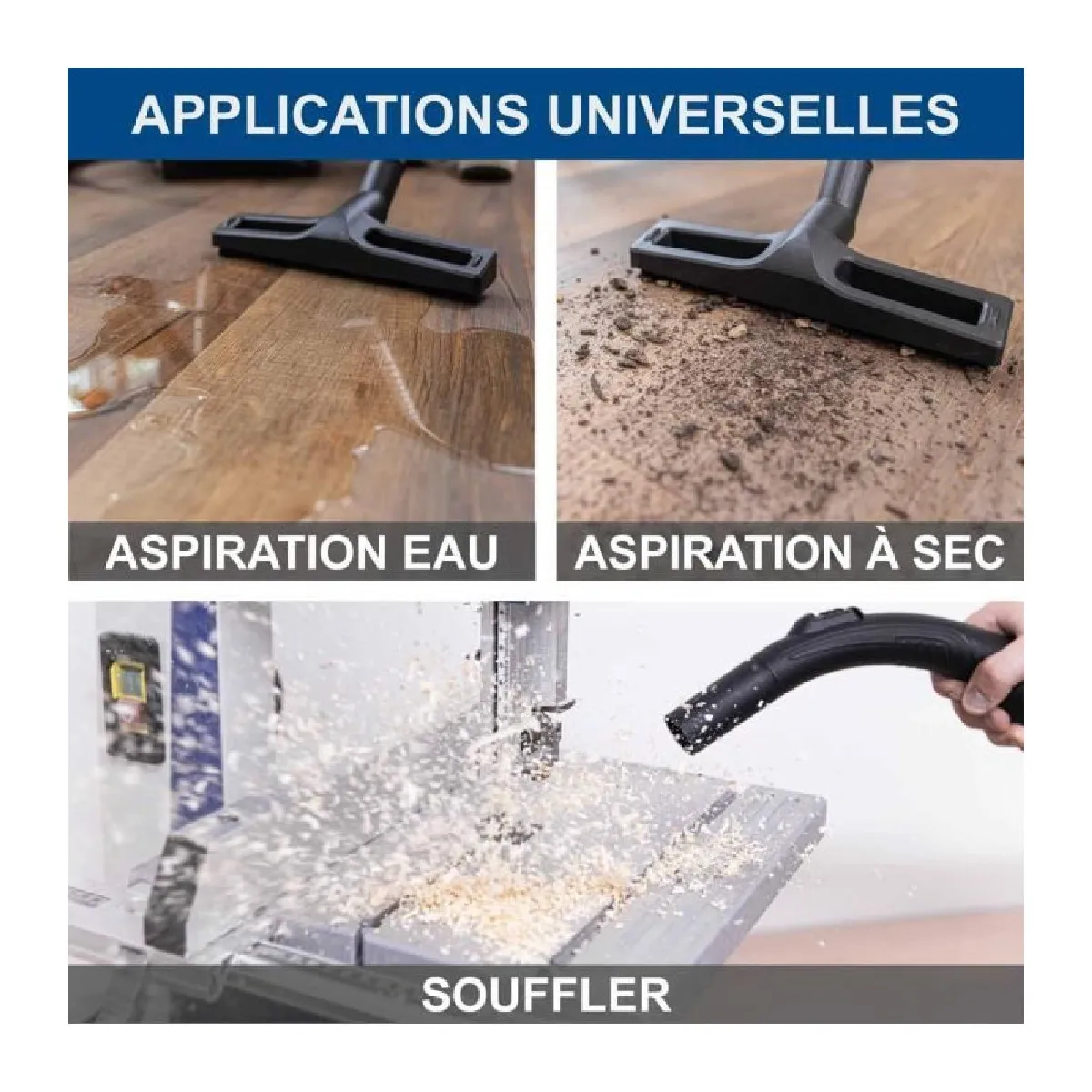 Aspirateur eau et poussière industriel - 1400 W, cuve inox, soufflage, prise outil 230 V, tuyau 3 m, câble 5 m, accessoires inclus