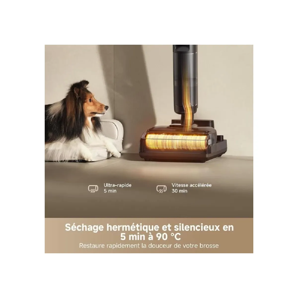 Après le nettoyage, la brosse profite d'un lavage par immersion à 100 °C dans le ThermoTub. Ce cycle aide à décoller les résidus et à préparer l'outil pour la prochaine utilisation. Le séchage hermétique et silencieux en 5 min à 90 °C limite l'humidité résiduelle dans la chambre de brosse. La station au sol sert de support de charge et centralise les opérations d'entretien pour une routine plus fluide.