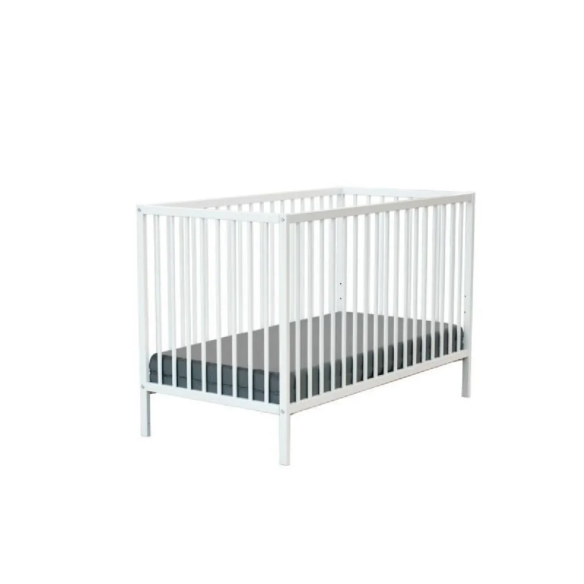 La construction en bois massif (hêtre) de style scandinave offre une surface lisse et uniforme, avec une teinte blanche facile à coordonner. Le lit répond à la norme EN 716 et s'utilise avec un seul matelas 60 x 120 cm, d'une hauteur maximale de 12 cm, en veillant à conserver un espace inférieur à 30 mm entre matelas et parois. Le montage est requis. La charge maximale recommandée est de 15 kg. Le lit est dépourvu de rangement et de roulettes, et la barrière n'est pas amovible.
