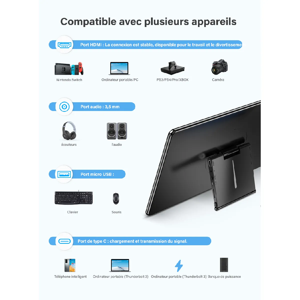 La connectique réunit HDMI pour le signal vidéo 1080p, USB-C compatible Thunderbolt 3 pour données/affichage selon l'hôte, un micro USB pour clavier ou souris et une sortie audio 3,5 mm. Le moniteur est alimenté à 15 W et peut être utilisé avec l'adaptateur PD 30 W fourni selon le scénario de branchement. Le châssis portable de 1,047 kg mesure 376 x 226 x 18 mm, pratique à transporter. Les LED d'ambiance multicolores (10 modes) proposent des options comme blanc, violet, bleu, cyan, vert, jaune, orange et rouge pour adapter l'environnement visuel.
