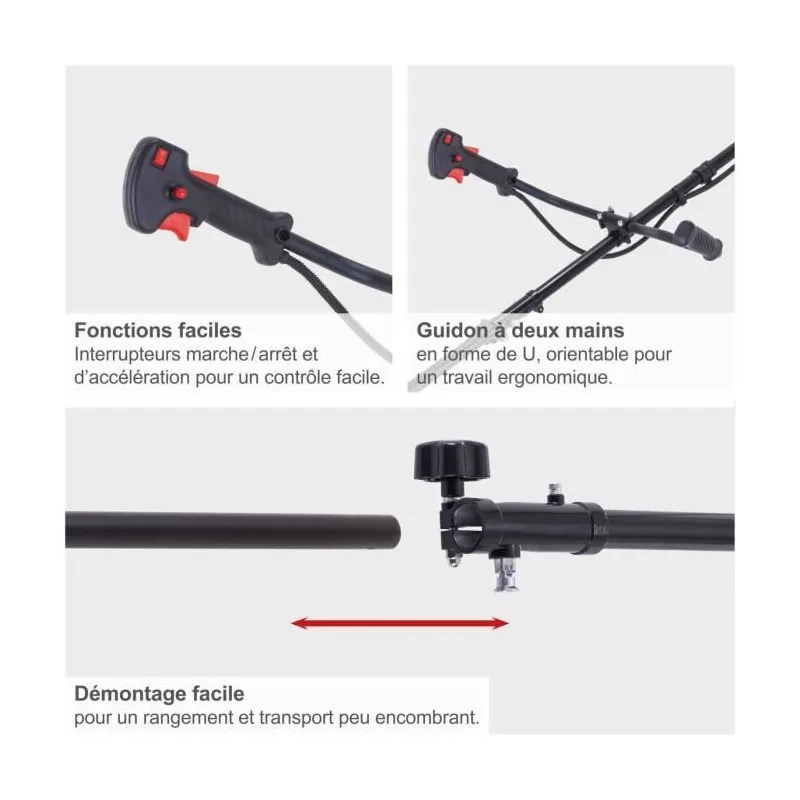 La gestion se fait sans complexité grâce au démarreur à câble Easy Start et aux commandes dédiées, avec bouton d'arrêt et blocage de la manette des gaz pour une maîtrise sûre. La conception met l'accent sur une utilisation prolongée avec antivibrations et harnais simple, réduisant la pénibilité lors des passages répétés. Le poids d'environ 8,3 kg optimise l'équilibre et le contrôle, pour conserver une posture de travail efficace lors des déplacements continus le long des bordures et des talus.