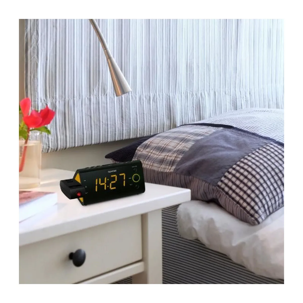 La lecture de l'heure reste nette en toutes circonstances grâce à un affichage LED 1,2" orange lisible et uniforme, complété par l'indication simultanée de la date et de la température intérieure. Pour plus de confort, l'heure peut être projetée au plafond via un projecteur orientable avec rotation 180°, pratique pour vérifier l'heure sans tourner la tête. Ce modèle compact s'intègre facilement sur une table de chevet et offre un usage simple au quotidien. Le tout est pensé pour un usage intérieur avec un réglage de luminosité et des commandes claires pour adapter l'affichage à l'environnement nocturne.