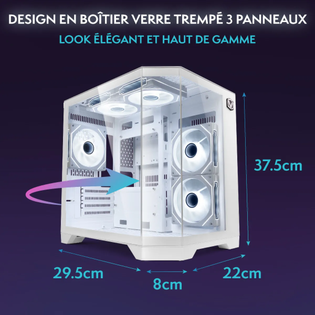 Boîtier: Boîtier gaming Vibox VTX-8 blanc avec vue panoramique et design à 3 panneaux en verre trempé pour un look élégant et moderne