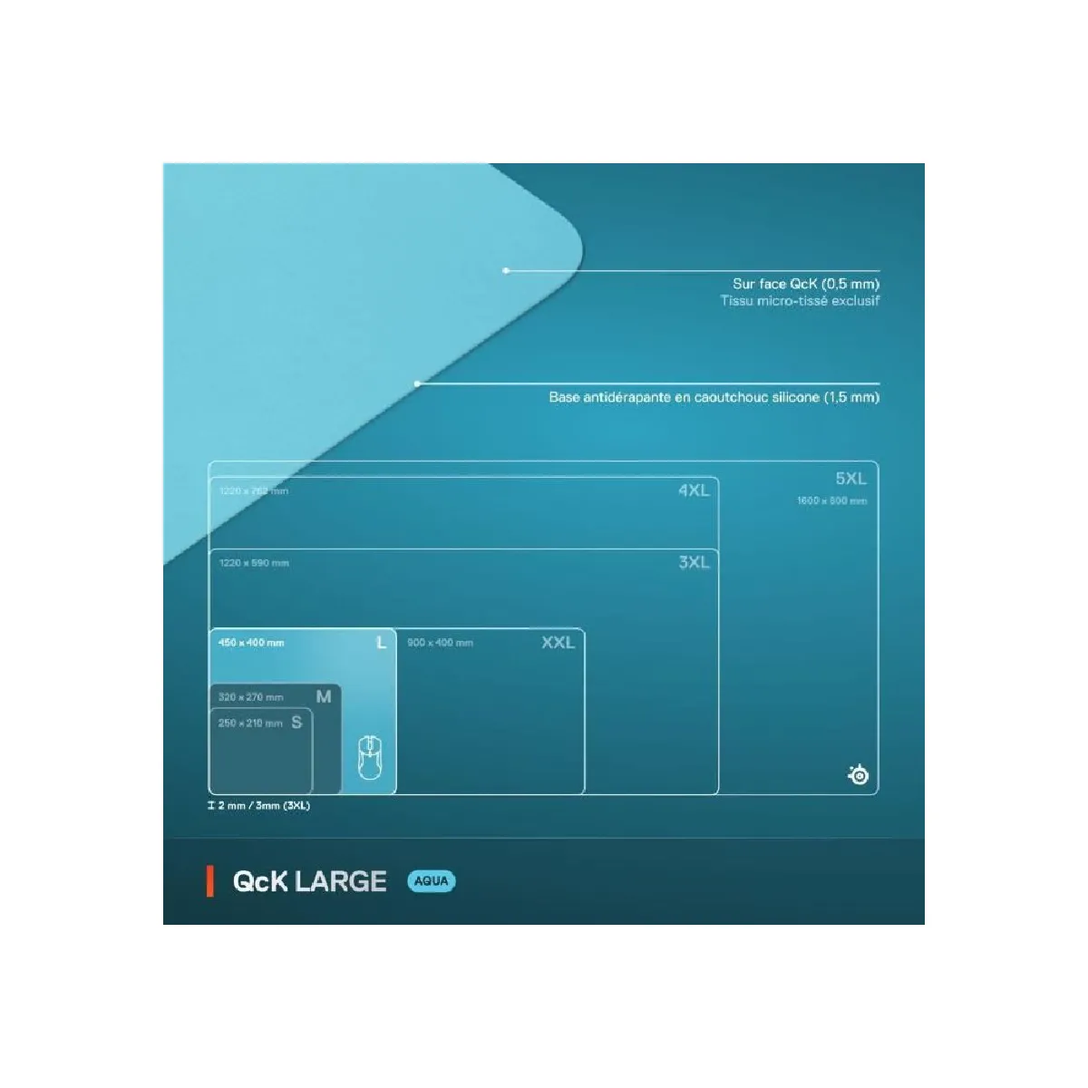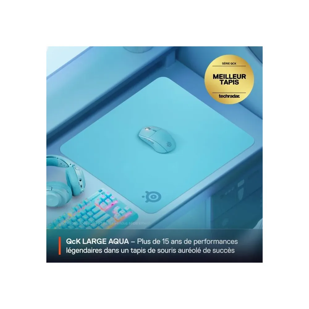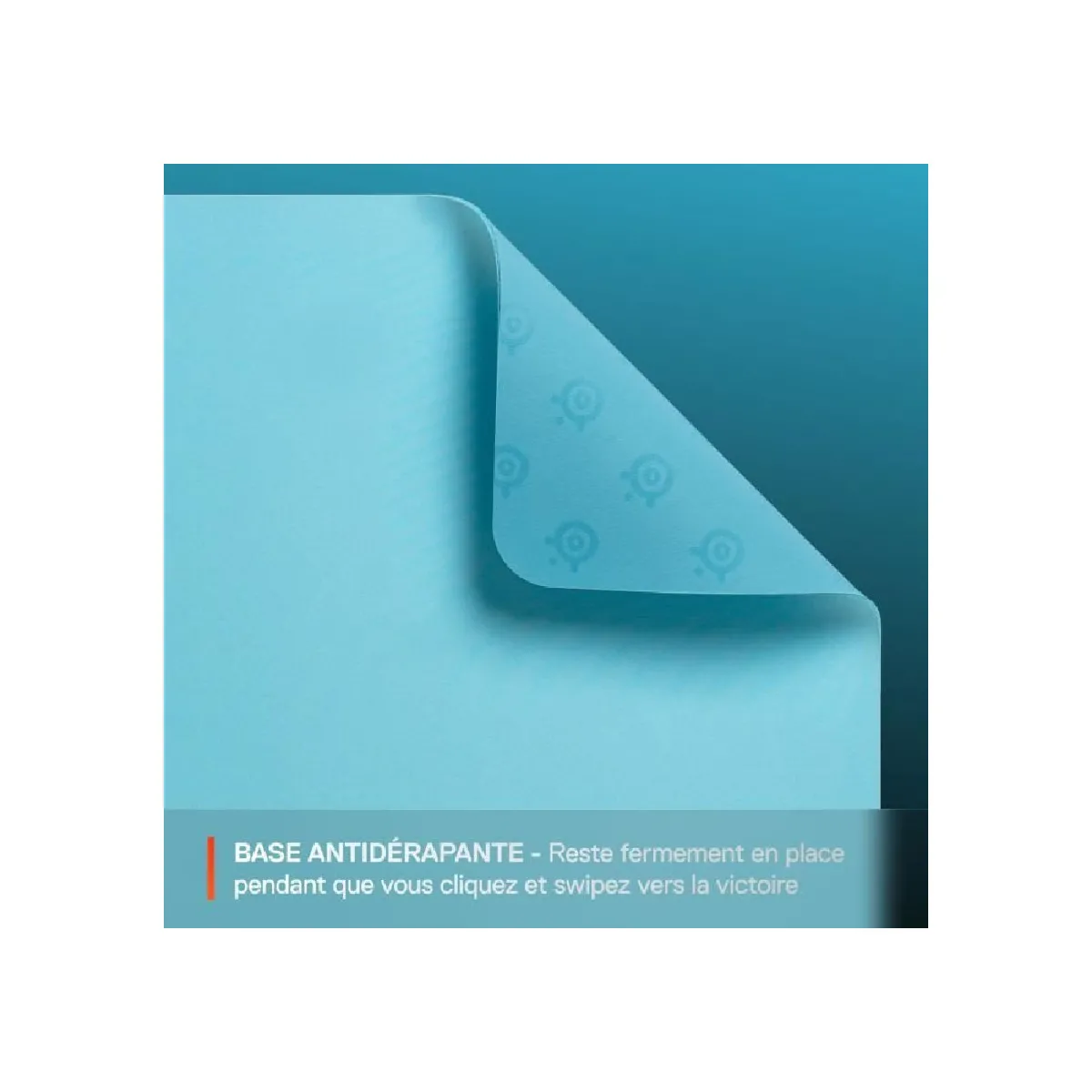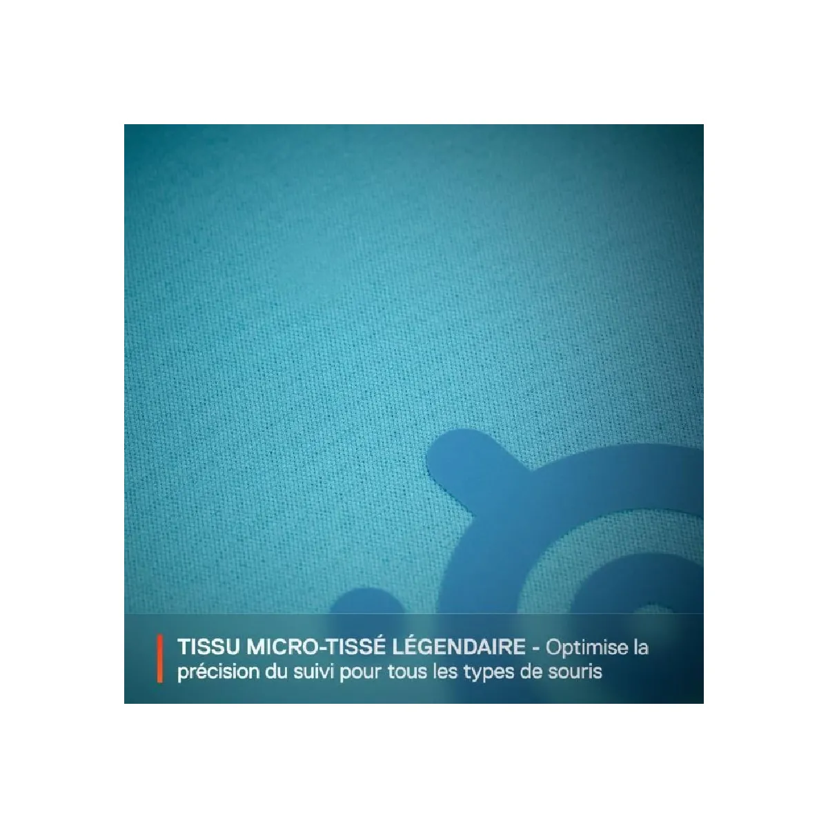 L'absence de RGB privilégie un poste de jeu simple et lisible, sans câbles ni réglages supplémentaires. La teinte cyan s'intègre dans des environnements sobres ou colorés, tout en restant uniforme. Le format QcK L offre l'amplitude nécessaire pour alterner précision et balayages rapides, avec une zone de contrôle suffisamment large pour ajuster la sensibilité sans déplacer le tapis.