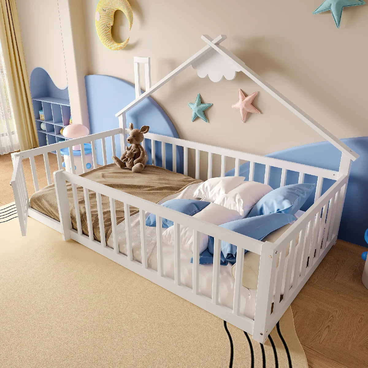 Lit enfant 90x190 cm - Lit avec barrières et sécurité - Bois de pin et MDF - Sans matelas - Blanc