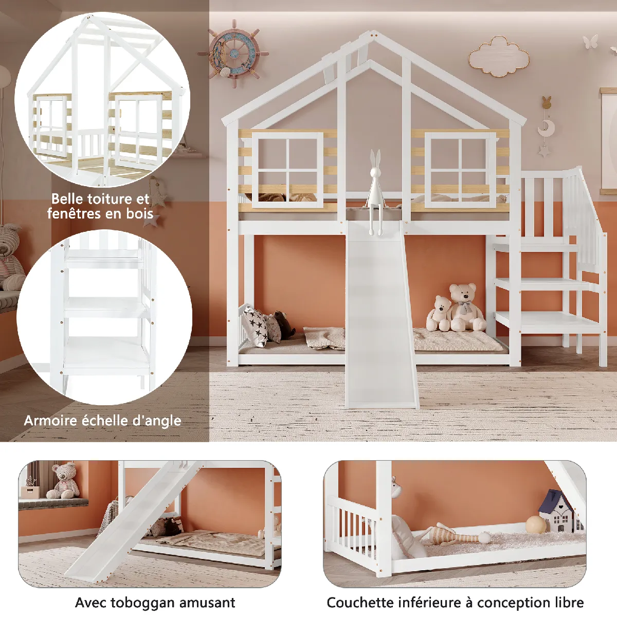 Lit Superposé 90x200 cm - Lit Simple enfant avec Échelle, Balustrade et Toboggan, Fenêtre Décorative, Structure Sécurisée en Bois Massif, Blanc