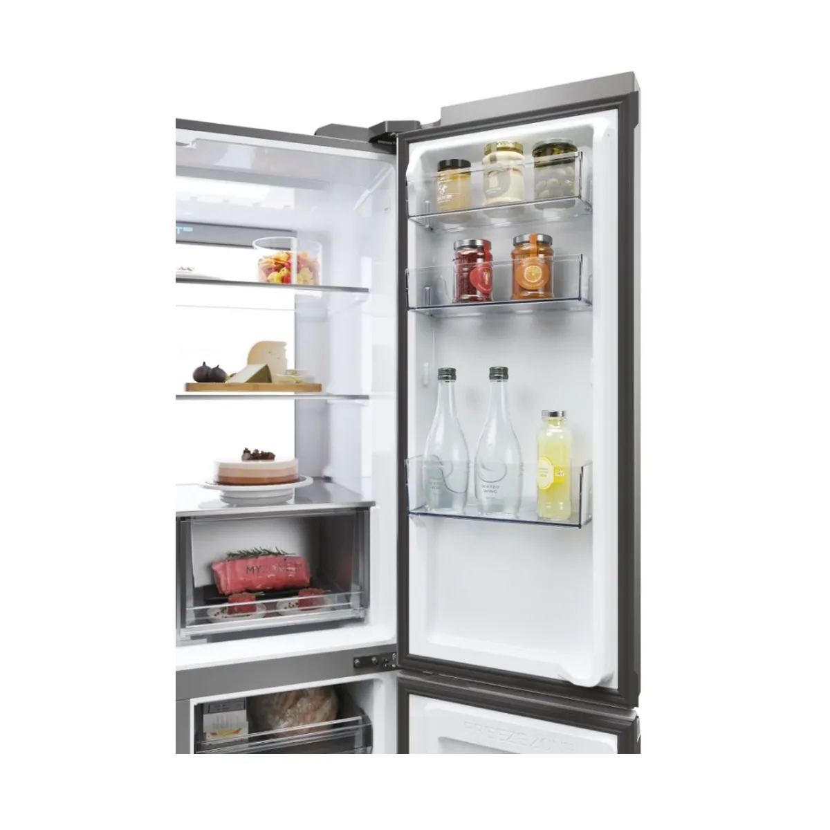 Le compartiment My Zone offre un contrôle rapide entre 0 °C et +5 °C selon les besoins : QuickCool, décongélation ou fruits et légumes. L'éclairage LED facilite la visibilité sur les clayettes en verre à cadre argenté et les balconnets transparents. Le ventilateur intérieur optimise la diffusion du froid et le panneau de commande électronique en façade permet d'ajuster précisément les réglages. Le mode Vacances réduit la consommation lorsque le réfrigérateur n'est pas pleinement utilisé.