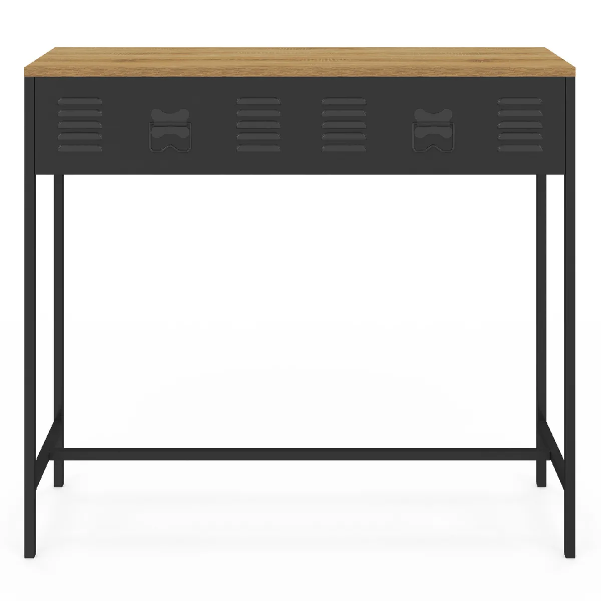 Laissez-vous séduire par cette console bi-matière et son look factory pour réaliser une décoration loft très tendance.Pratique grâce à sa belle surface supérieure, vous pourrez y déposer des objets déco comme un miroir et y laisser un vide-poche pour vos clés. Son long tiroir offre un espace de rangement fermé idéal pour vos effets personnels qui permet de désencombrer le plateau tout en gardant vos essentiels à portée de main. Vous pourrez ranger en toute discrétion vos papiers et documents. Avec ses dimensions astucieuses, elle sera également parfaite utilisée comme petit bureau ou comme meuble TV dans la chambre, pour créer un espace détente propice à l'endormissement !Stable et robuste grâce à sa structure en particules de bois et ses pieds en métal, vous pourrez déposer tablette, lampe d'appoint et livres en toute sérénité.Original et design, avec ses finitions soignées, ce meuble bicolore trouvera facilement sa place dans tous les types d'intérieur ! Dimensions de la console 1 tiroir ESTER 2 étagèresDimensions globales : Longueur 90 cm x largeur 30 cm x Hauteur 80 cmDimensions du tiroir : L. 81 x l. 25 x H. 10 cmHauteur du tiroir : 16 cmMatériaux : Panneaux de particules et métal Coloris : bois et noirRetrouvez l'ensemble de notre collection industrielle sur notre boutique en ligne !
