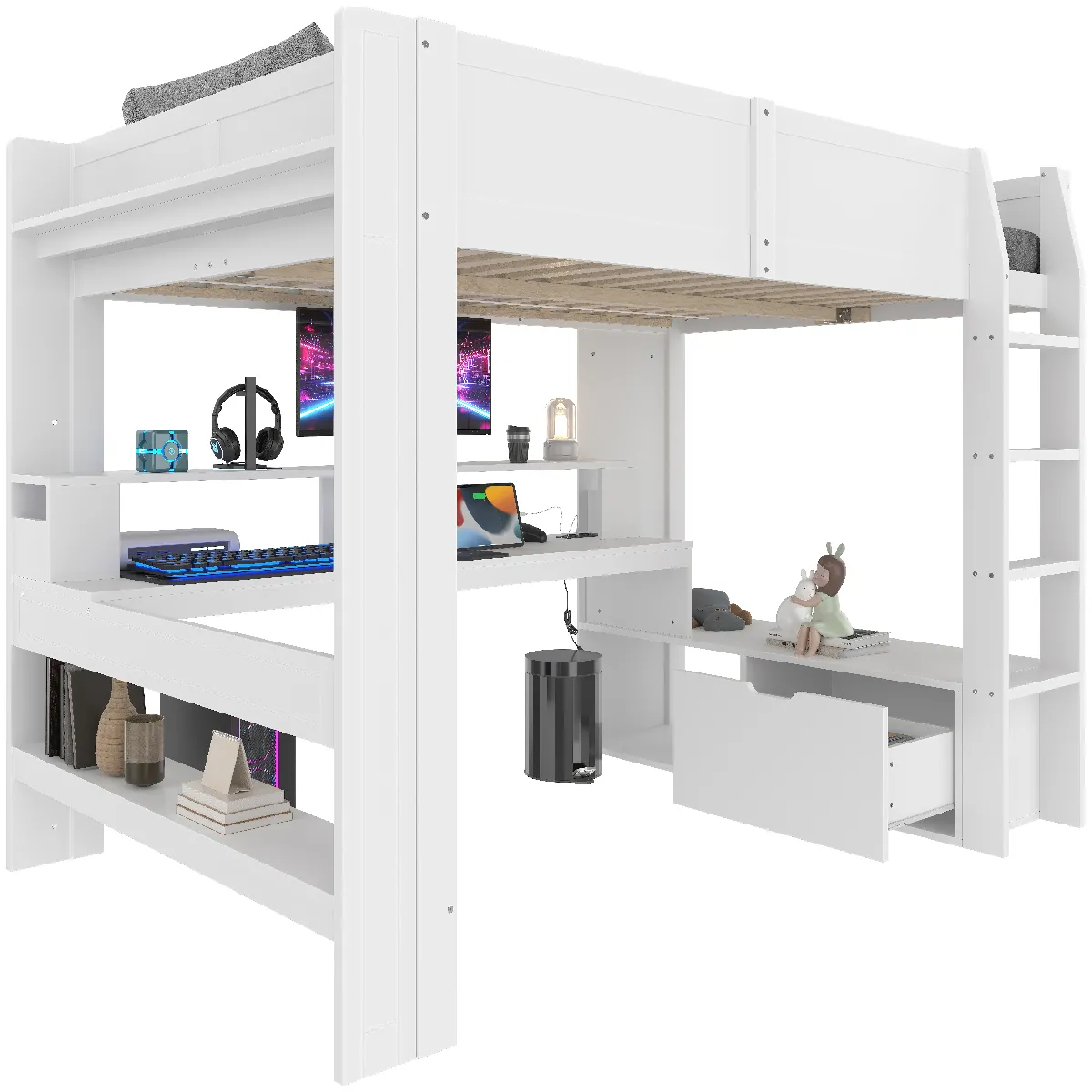 Lit mezzanine 140x200 cm - Lit avec bureau intégré et rangement - Pin et MDF - Sans matelas - Blanc