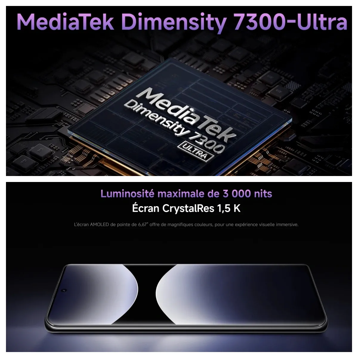 - Processeur MediaTek Dimensity 7300Ultra à 2,5 GHz