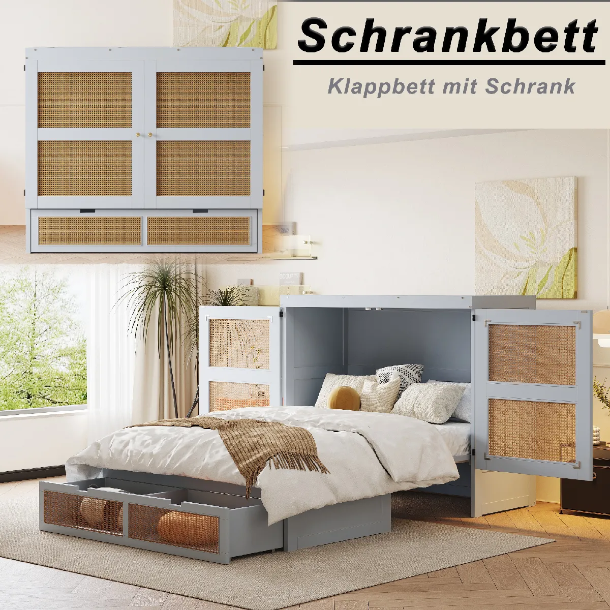 Lit Escamotable 140x200 cm - Lit Escamotable avec Sommier et 2 Tiroirs de Rangement, Structure Bois de Pin et MDF, Sans Matelas, Gris