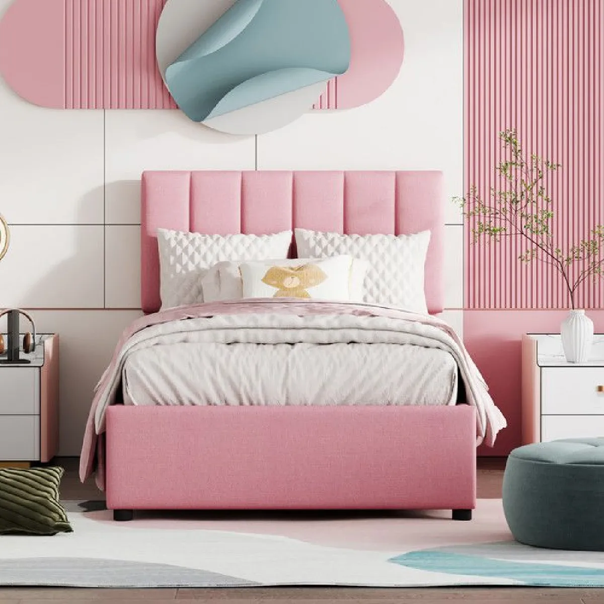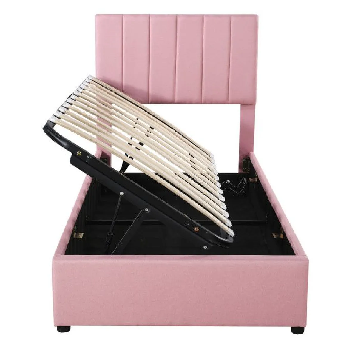 Lit coffre 90x200cm pour enfant, idéal pour optimiser l'espace avec son rangement hydraulique. Tête de lit réglable et design en lin rose, ce lit une place allie confort et praticité. Parfait pour une chambre d'enfant.