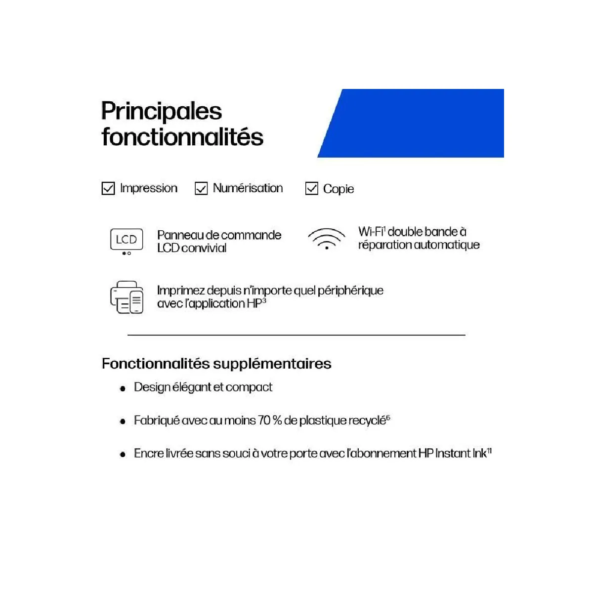 - Connectivité : WiFi 802.11a/b/g/n, USB (1) ; impression mobile via application HP, Mopria et AirPrint